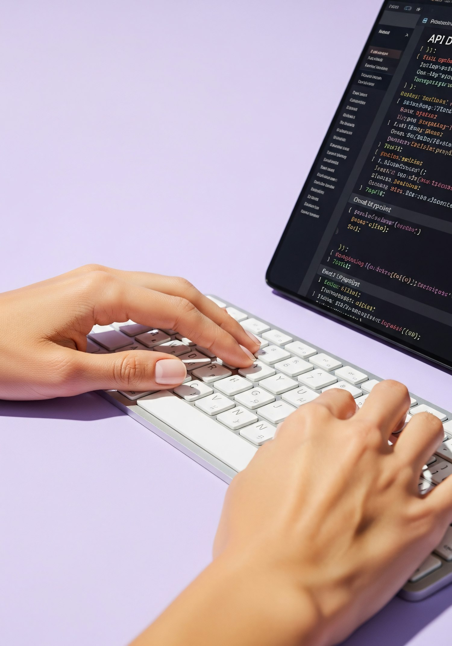 Hands typing on a white keyboard with a laptop displaying code, set against a pastel purple background for a modern tech vibe.