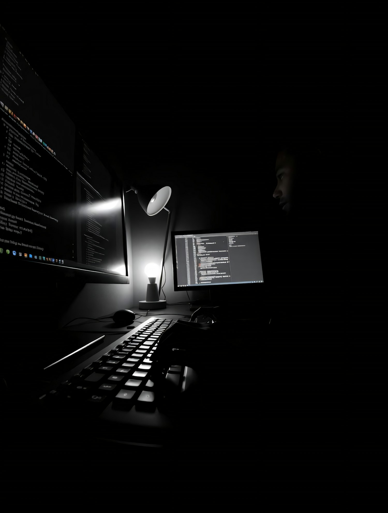 A dark workspace with dual monitors showing code, a keyboard, and a desk lamp, creating a focused and dramatic atmosphere.