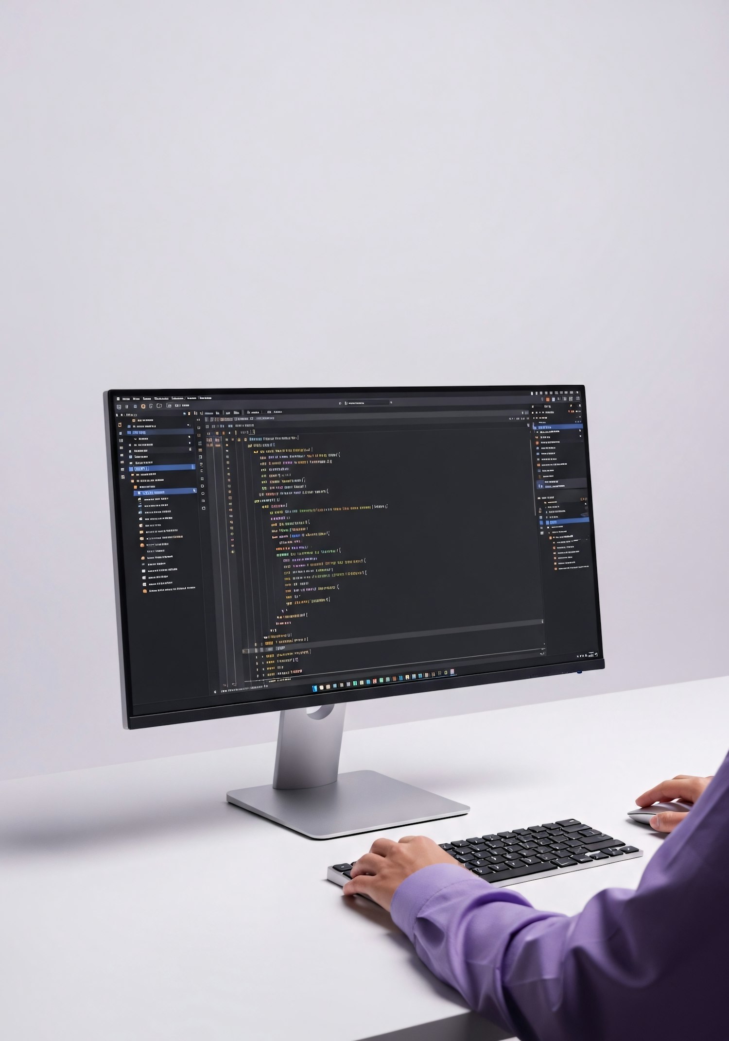 A programmer working on a sleek computer setup with a dark-themed code editor, showcasing a clean and modern workspace.