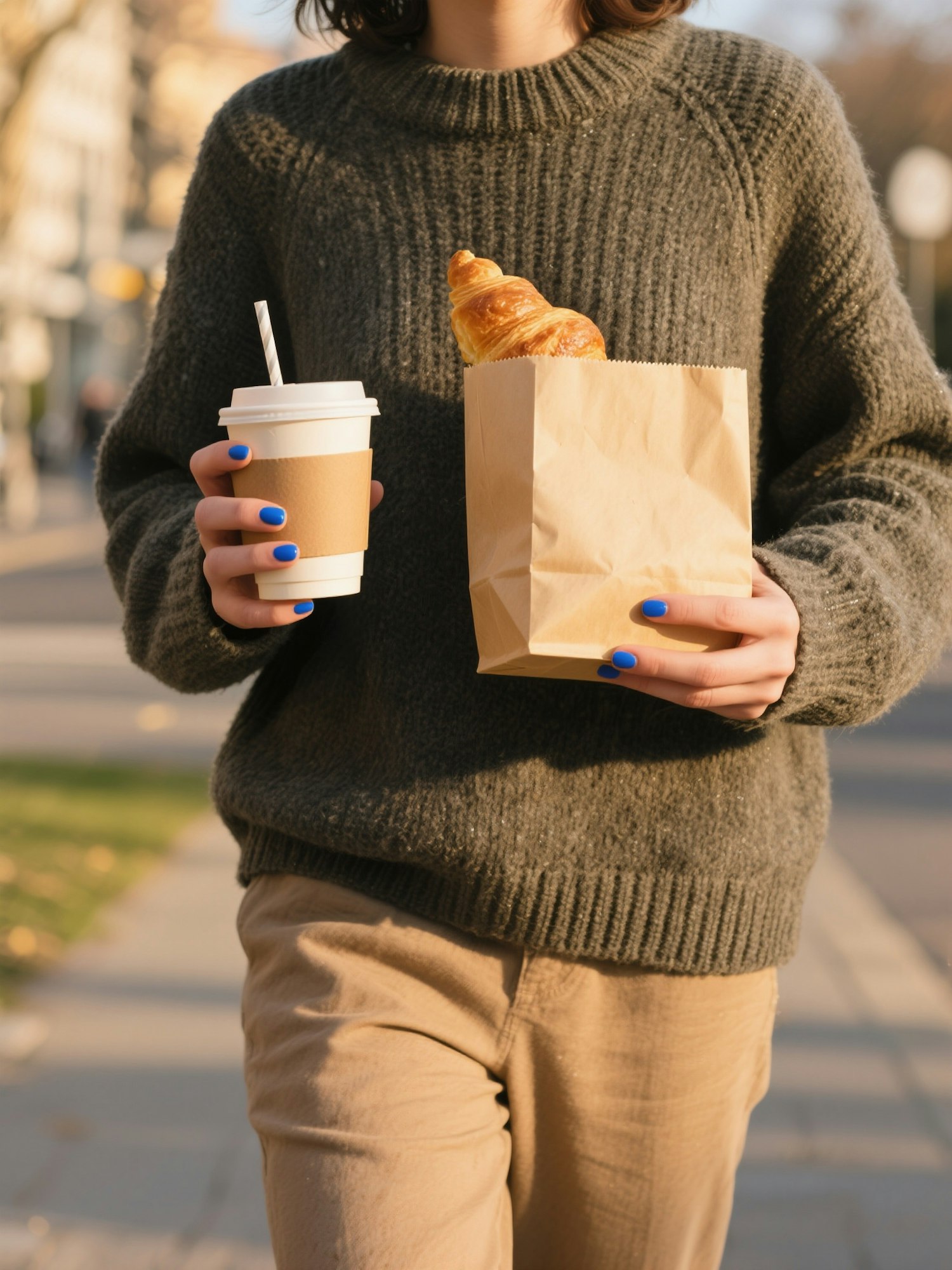 A person in a green sweater holds a coffee cup and a croissant in a paper bag, with vibrant blue nails adding a pop of color.