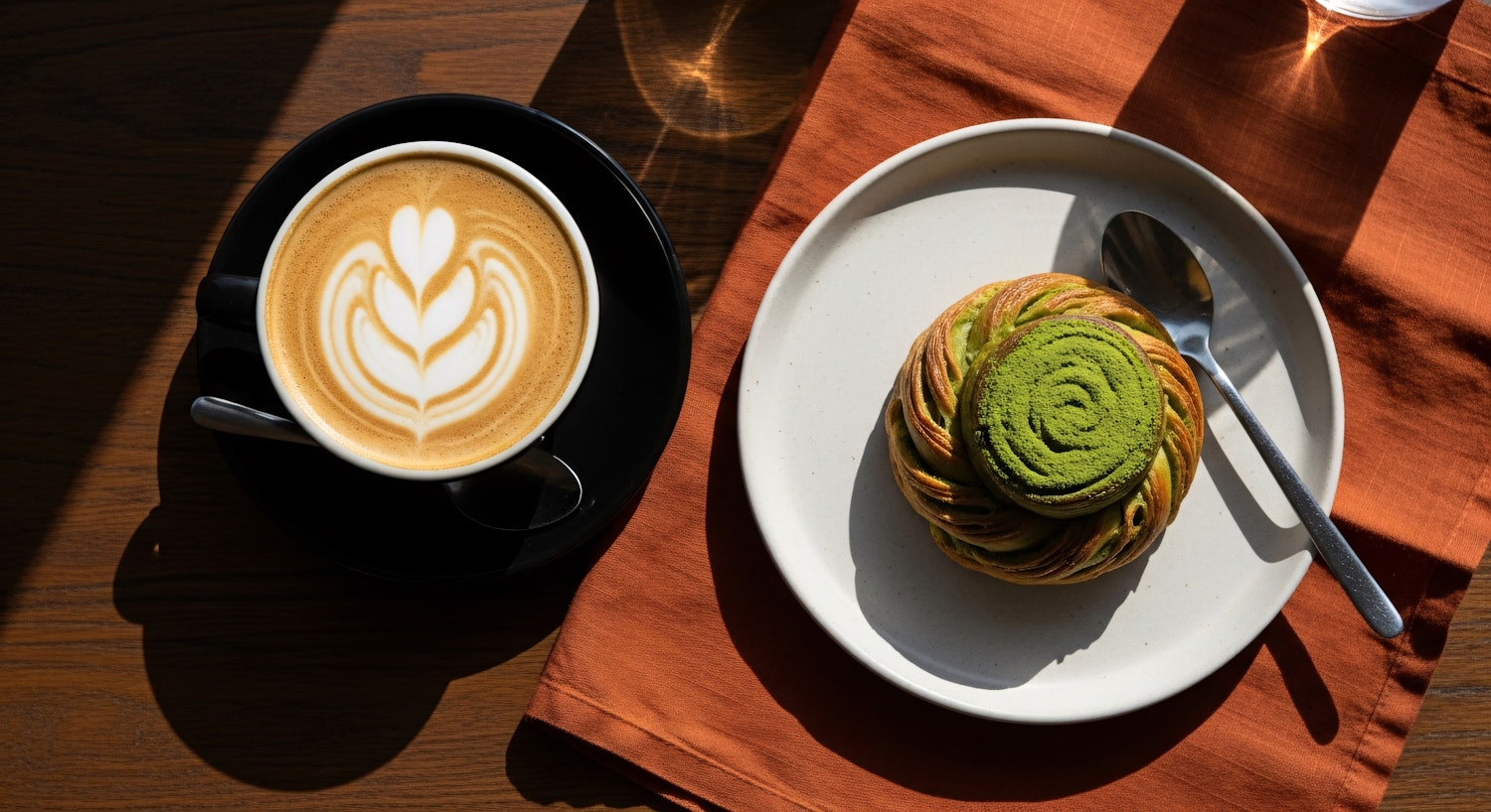 A latte with tulip art and a matcha pastry on a plate, set on a wooden table with an orange napkin and sunlight streaming in.