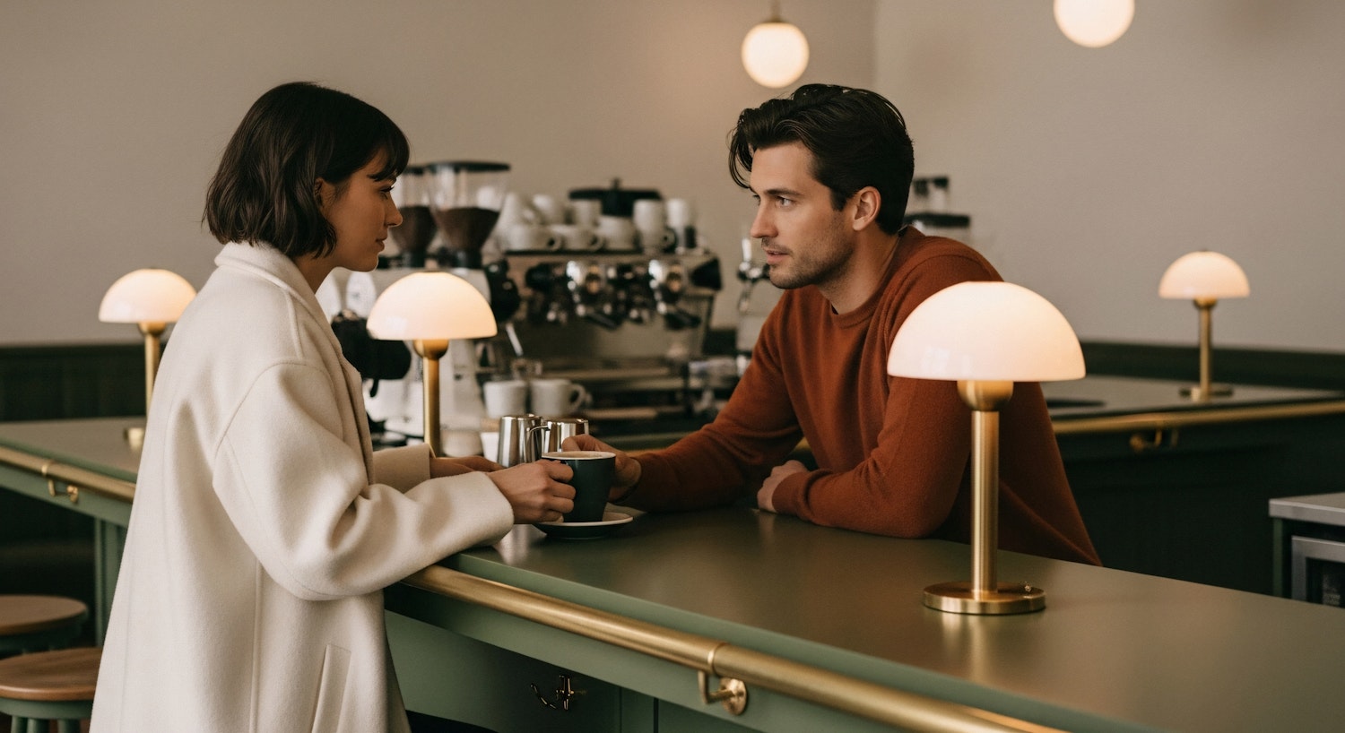 A man and woman chat over coffee at a stylish café bar with green and brass accents, modern lighting, and a cozy ambiance.