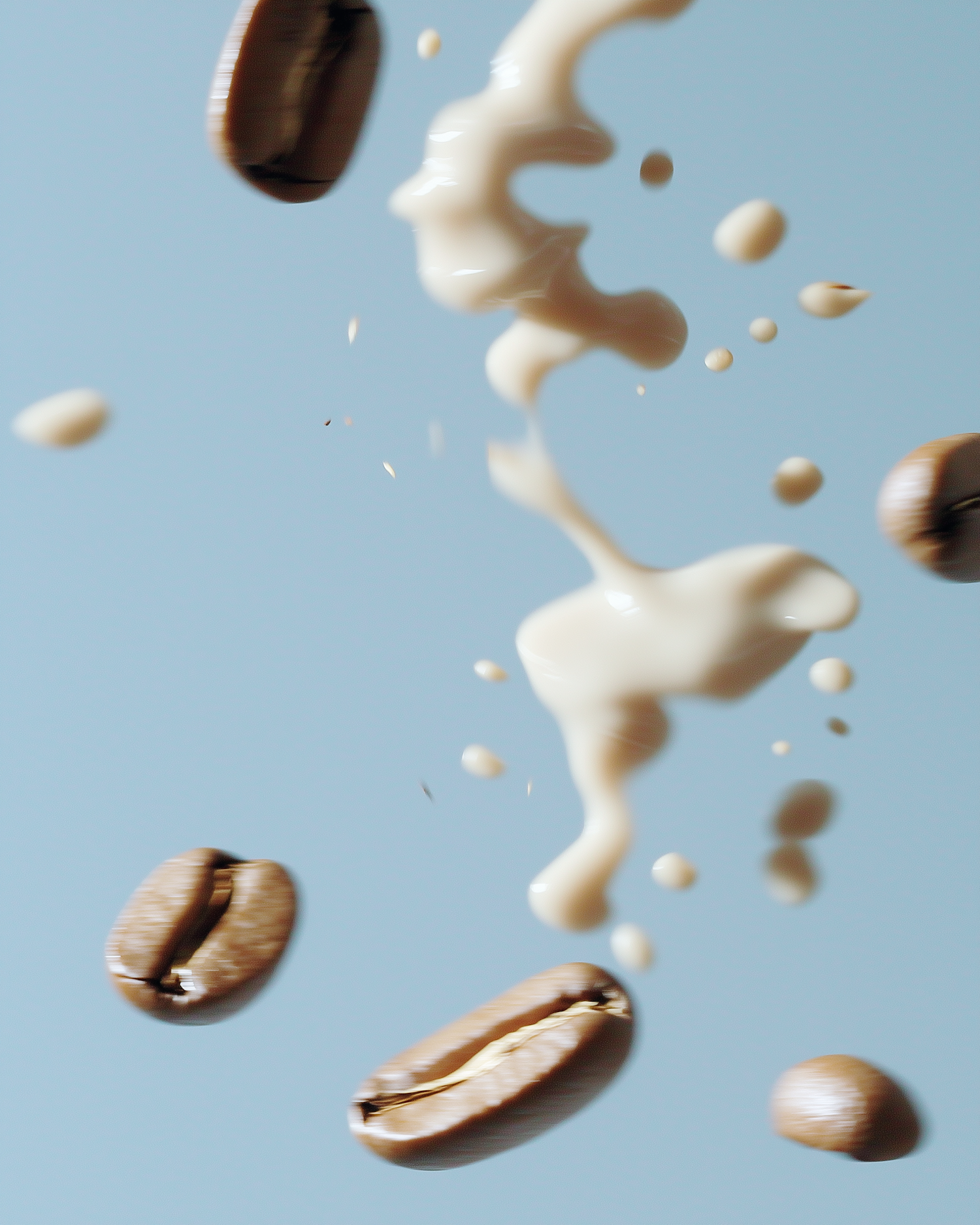 Close-up of coffee beans and cream splashes in mid-air, set against a light blue background. A perfect blend of texture and motion.