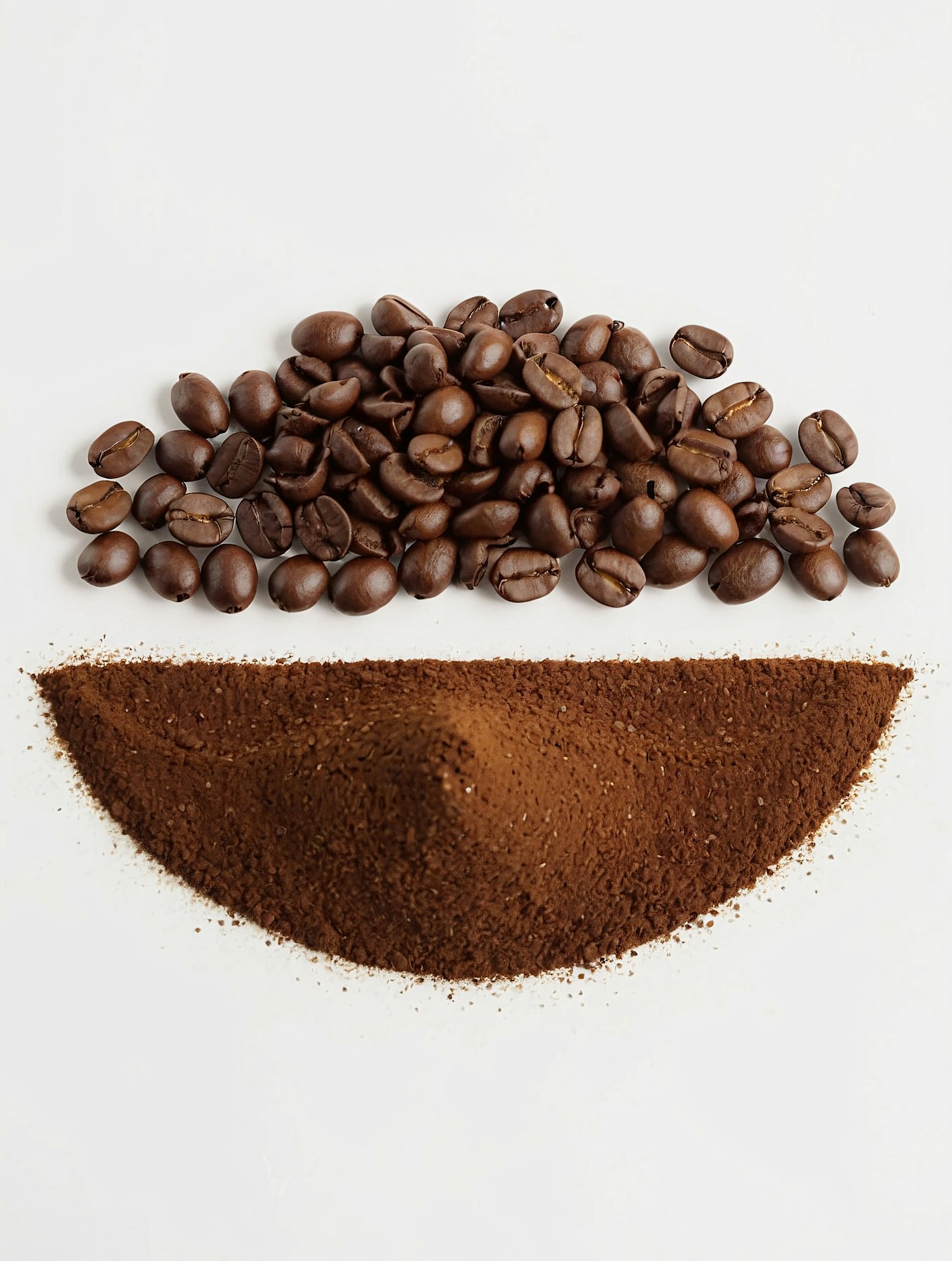 A close-up of coffee beans and ground coffee on a white background, showcasing their rich textures and earthy tones in a clean composition.
