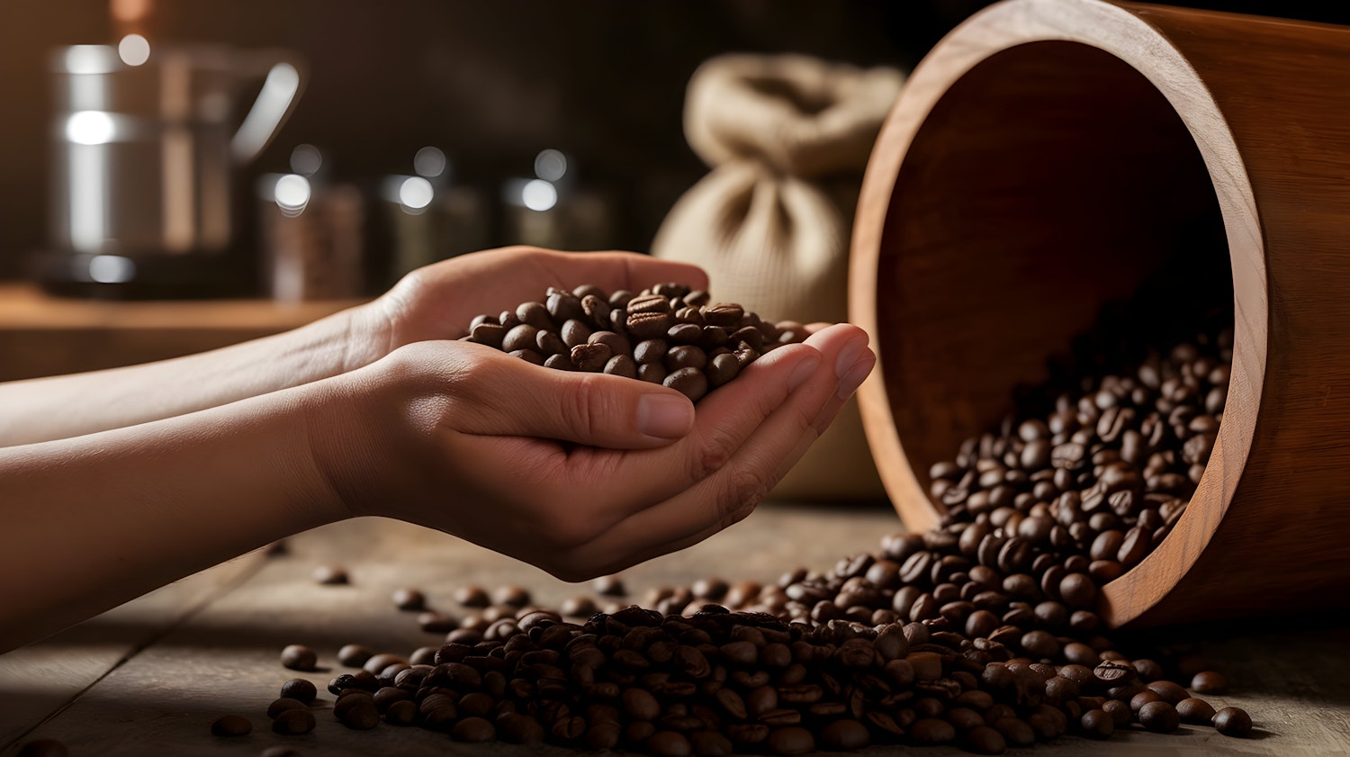 Hands holding roasted coffee beans spilling from a wooden container, with a rustic burlap sack in the background. Warm and cozy vibes.
