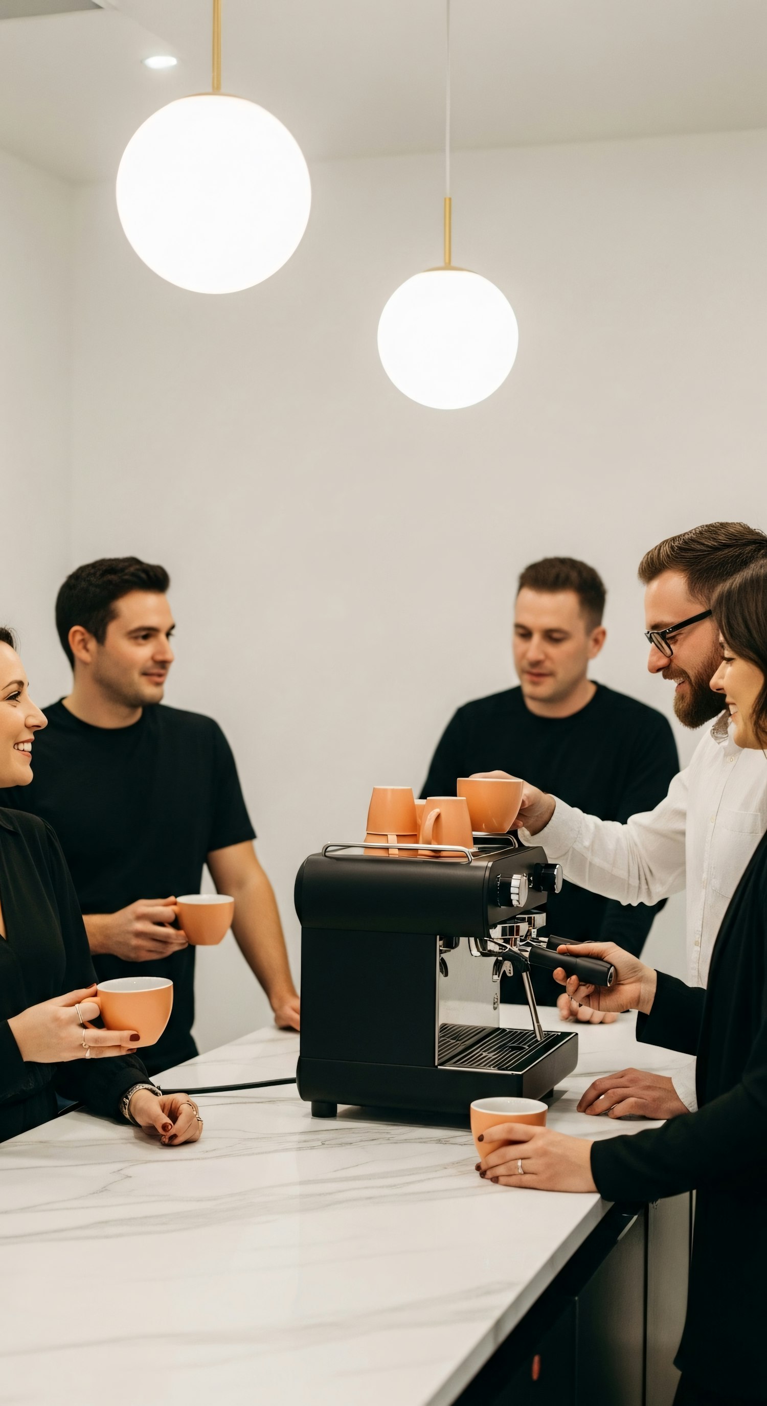 A group of colleagues enjoying coffee together around a sleek coffee machine in a modern, minimalist kitchen setting.