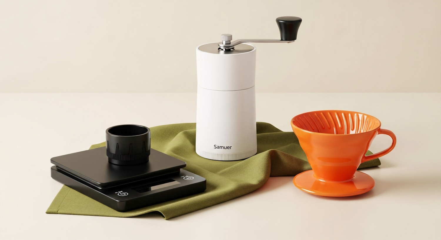 Minimalist coffee brewing setup with a white grinder, black scale, and orange dripper on a green cloth. Perfect for coffee enthusiasts.