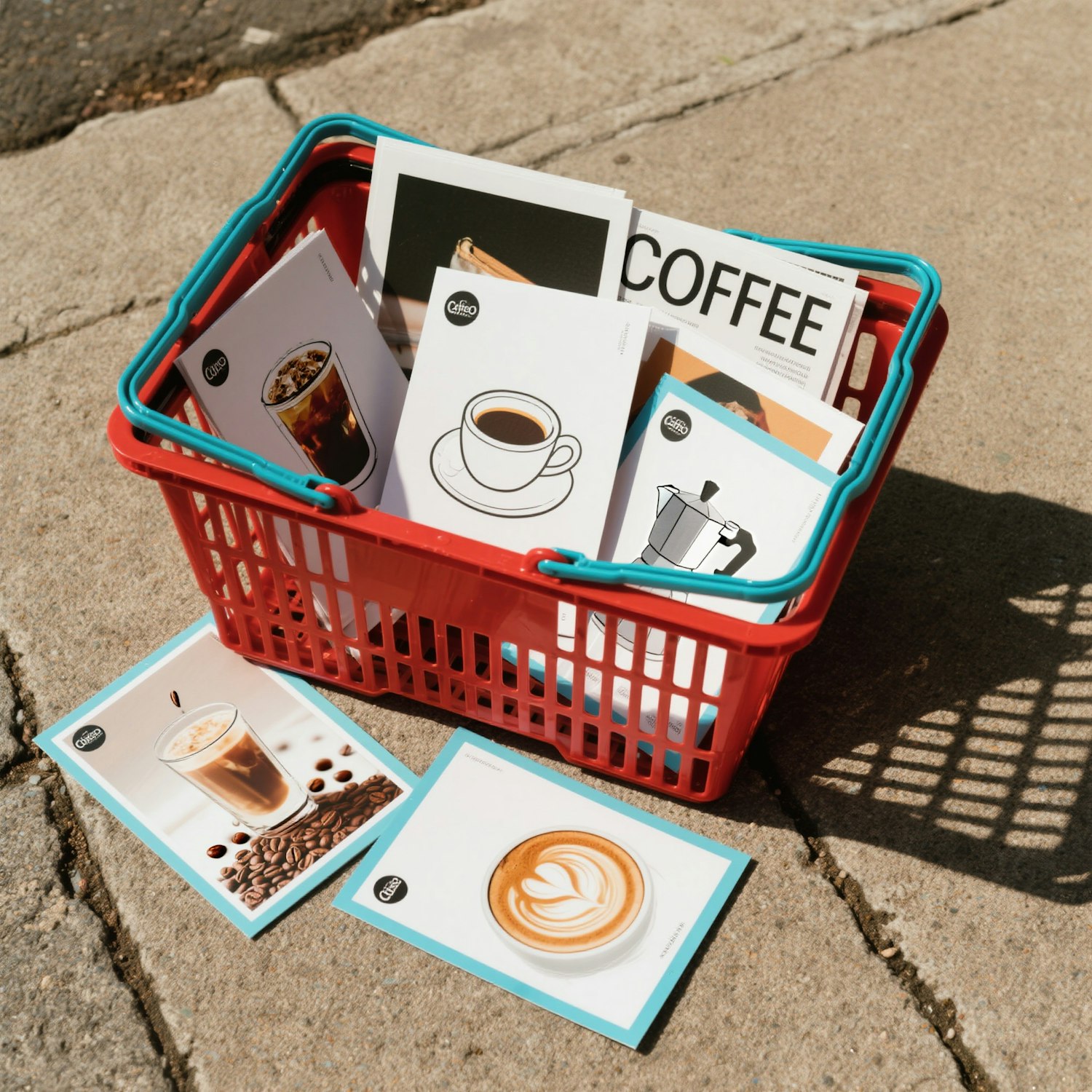 A red basket filled with coffee-themed cards on a sunny sidewalk, showcasing coffee illustrations and photos in a casual setting.