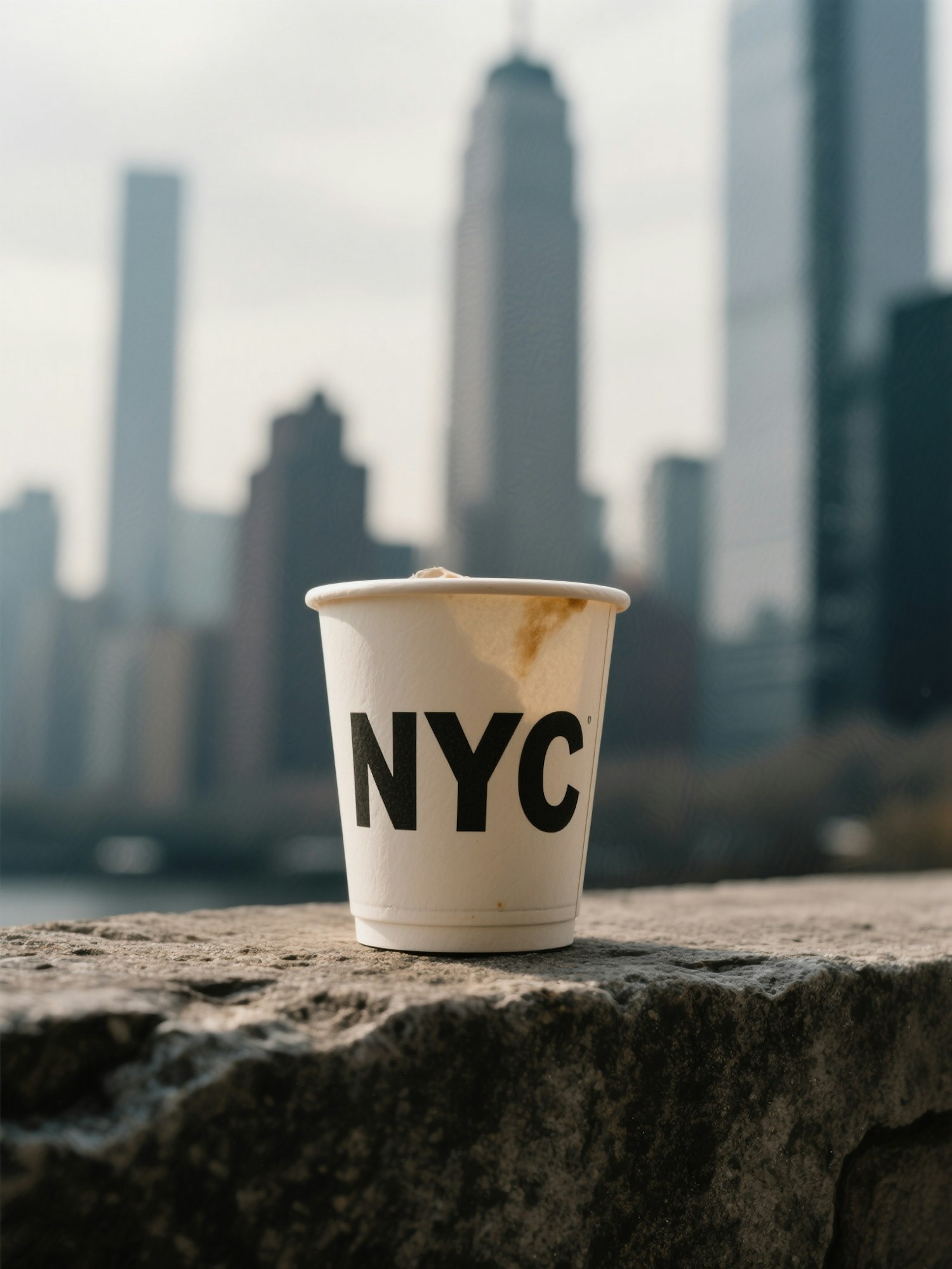 A white coffee cup with 'NYC' printed on it sits on a stone ledge, with a blurred New York City skyline in the background.