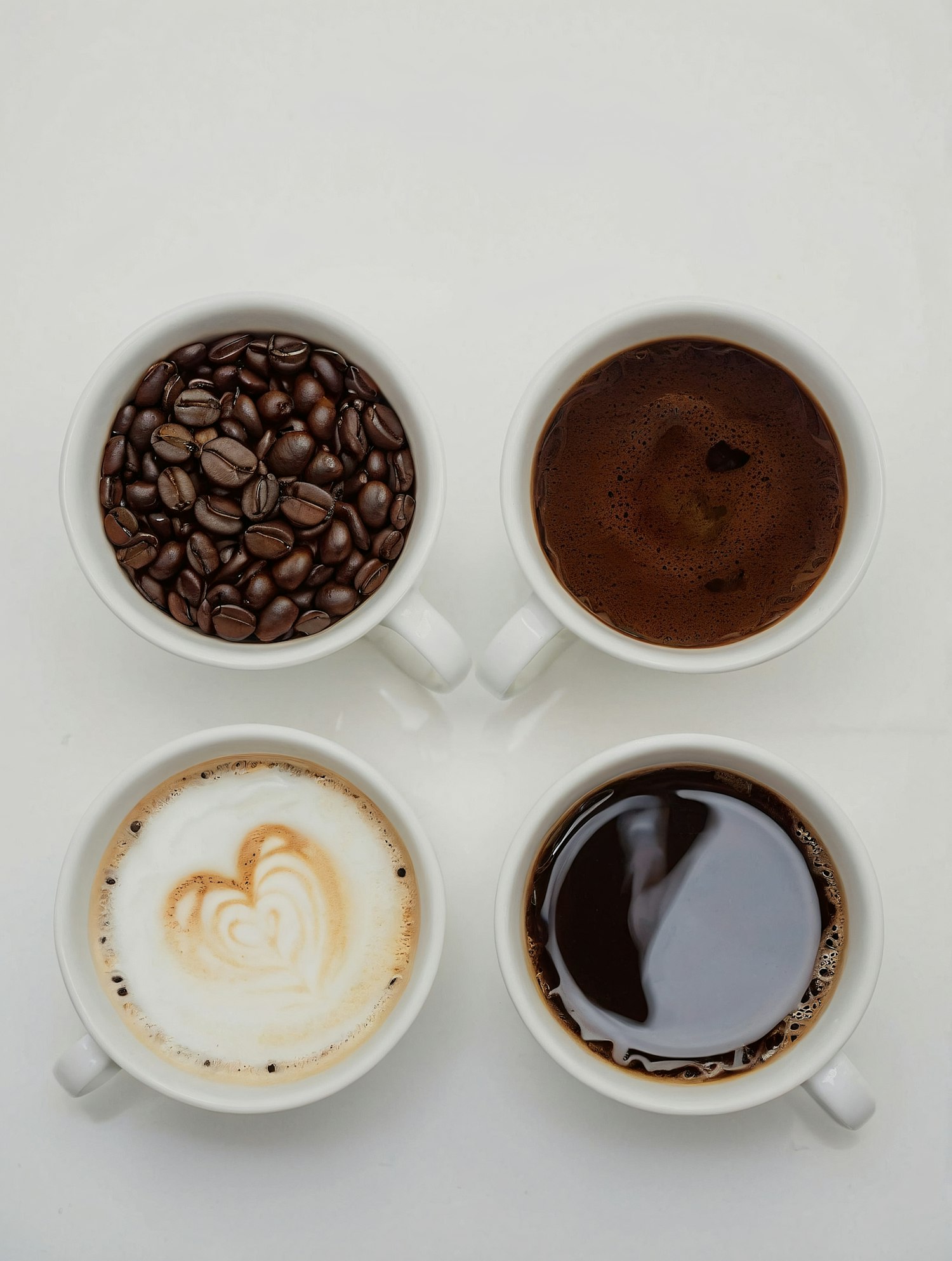 Four coffee cups showcasing beans, espresso, latte art, and black coffee on a clean white background. Perfect for coffee lovers!