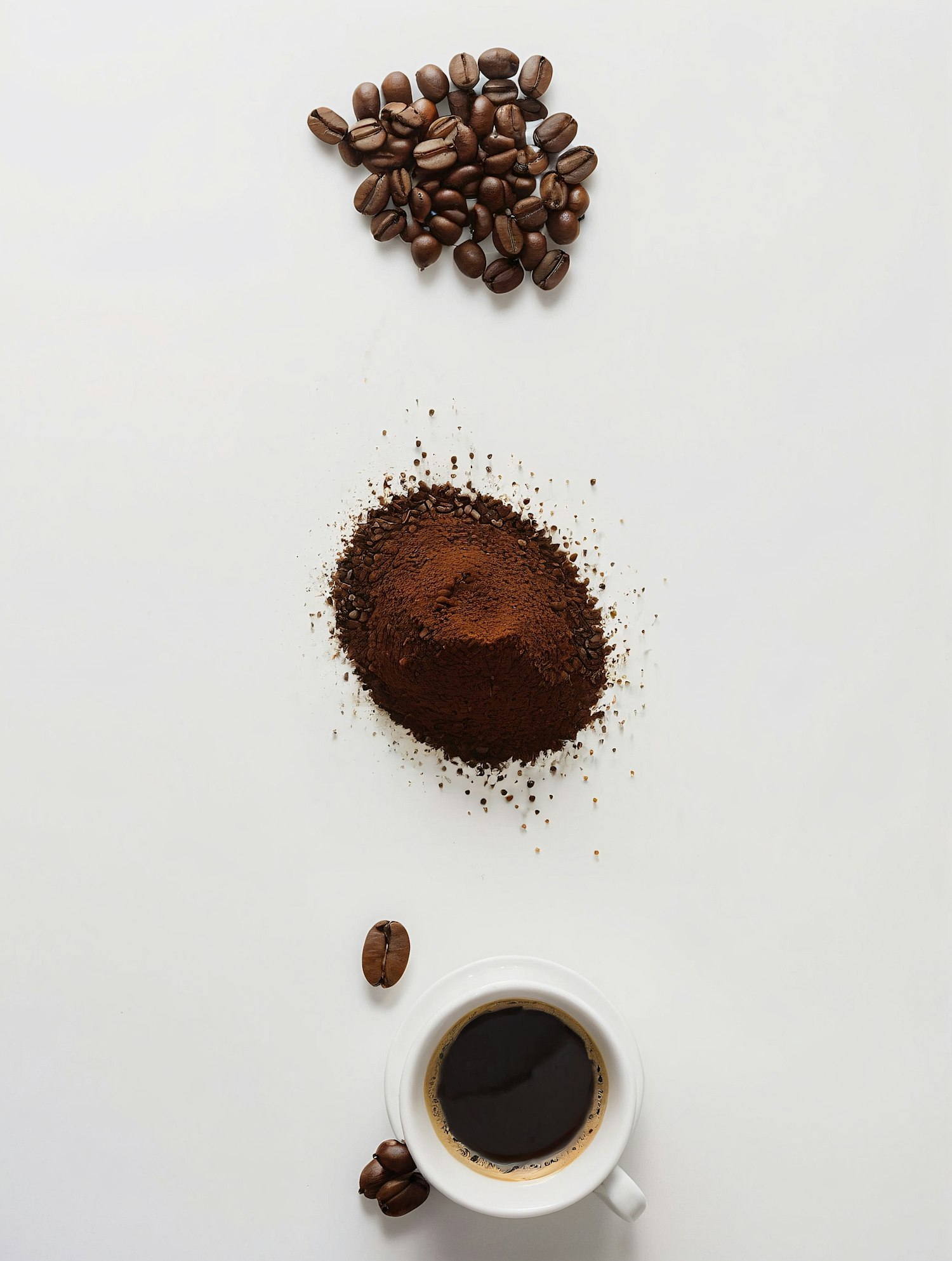 Minimalist coffee journey: beans, ground coffee, and a cup of black coffee on a clean white background. Perfect for coffee lovers.