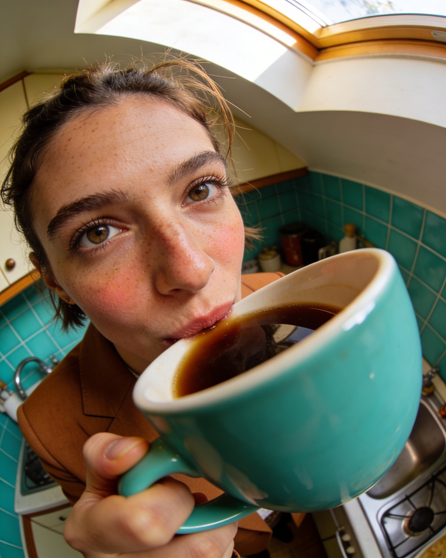 Ultra-realistic fisheye close-up portrait of a woman drinking coffee from a turquoise ceramic mug, shot from a high tilted angle with strong wide-angle lens distortion (fisheye look). The woman stands in a small retro kitchen with teal tiles on the wall, warm natural daylight coming from a window above. She holds the mug close to her lips, looking slightly upward toward the camera. The female subject has natural textured skin with visible pores, soft micro-imperfections, subtle peach fuzz, realistic highlights and shadows, no over-smoothed or plastic look. Medium warm skin tone with natural color variation around cheeks and nose. Hair is short or tied back with visible individual strands and flyaways, soft natural shine, slightly imperfect styling to enhance realism. No glasses on the face. Neutral confident expression. She wears a tailored vintage-style blazer in warm brown tones. Cinematic editorial photography style, authentic candid feeling, like a spontaneous phone photo but with professional color grading. Strong perspective distortion from fisheye lens, foreground mug appearing larger, background slightly curved. Soft film grain, natural color balance, realistic lighting, documentary fashion photography mood.