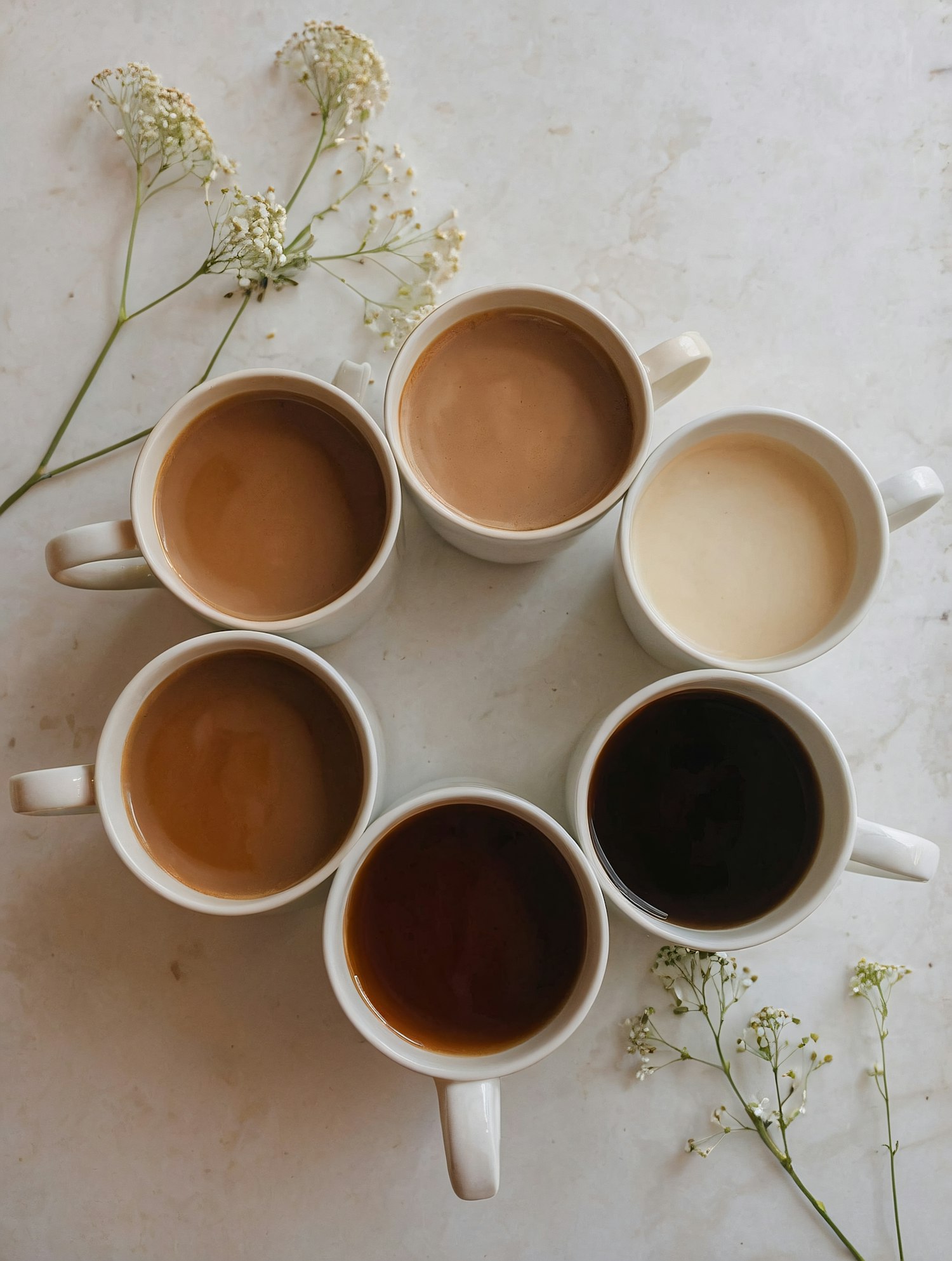 Seven mugs of coffee in varying shades arranged in a circle on a marble surface, accented with delicate baby's breath flowers.