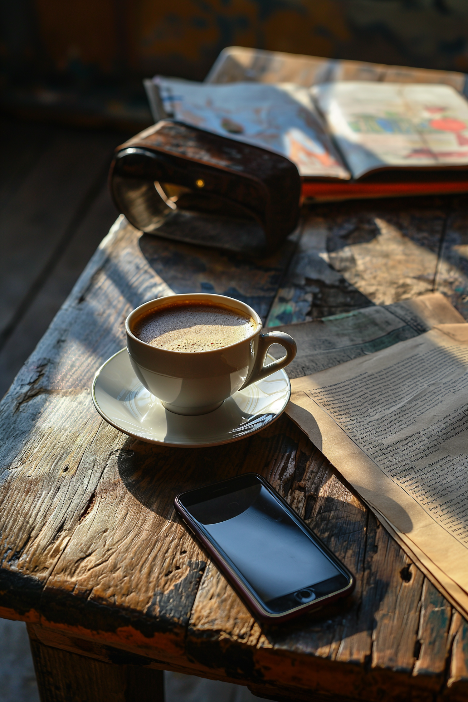 Cozy scene with a coffee cup, smartphone, and open book on a rustic wooden table in warm sunlight.