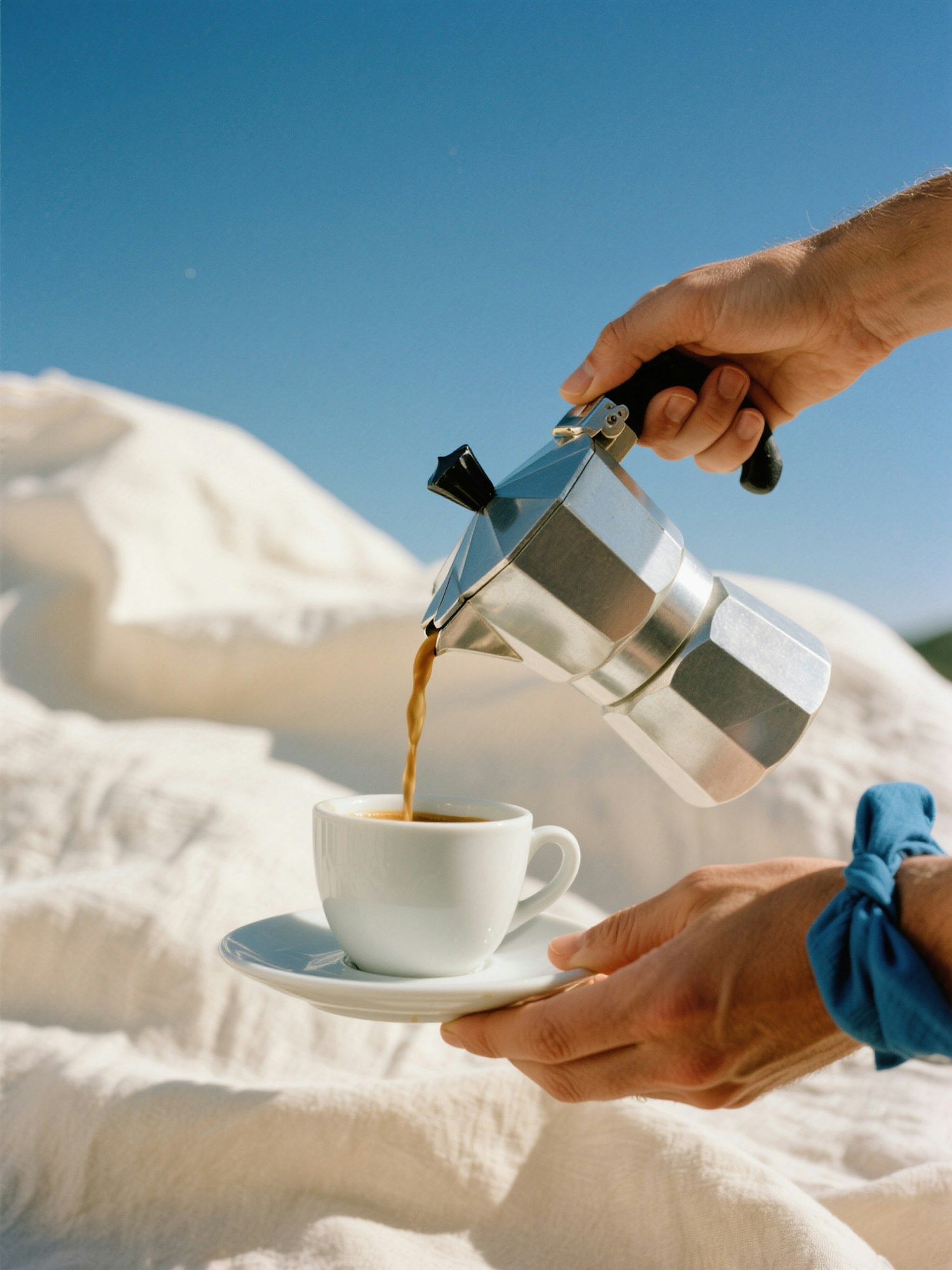 A sunlit scene of a moka pot pouring coffee into a white espresso cup outdoors. Two hands meet mid-frame, one holding the moka pot and the other balancing the cup and saucer. The sky is clear and deep blue, a linen cloth gently blowing in the background. Add a pop of electric blue in the napkin tied around the wrist of the moka pot hand. Captured on Portra 400 film with subtle shadows, soft warm tones, and vintage grain.
