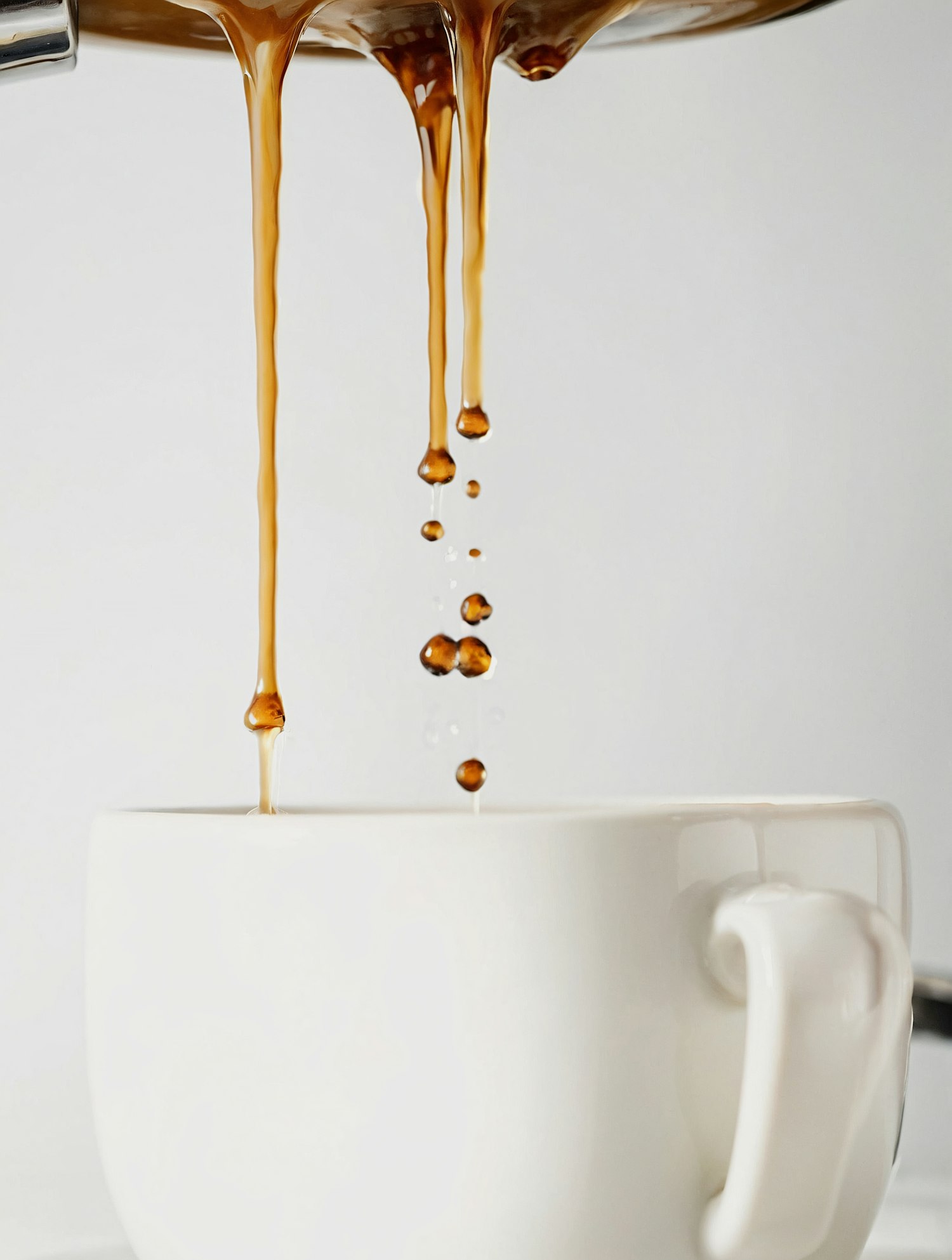 Close-up of coffee dripping into a white ceramic cup, capturing the rich golden-brown tones and clean minimalistic background.