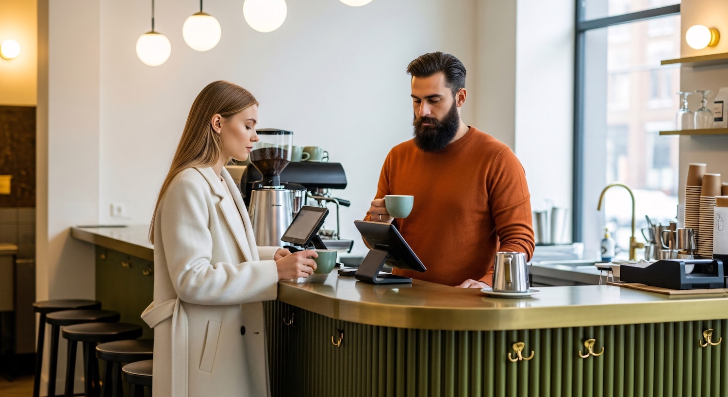 A barista and customer interact in a stylish coffee shop, featuring a green counter, modern decor, and warm lighting.