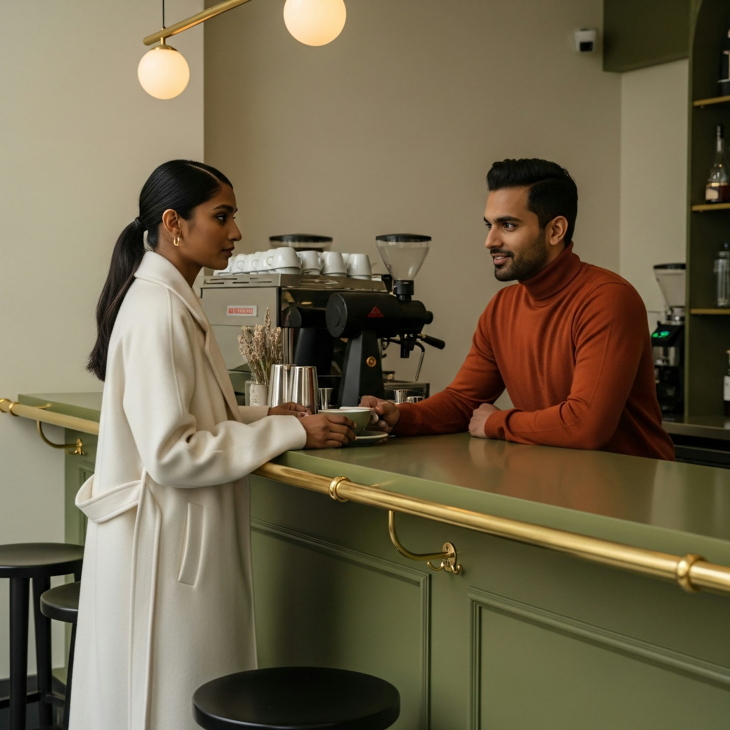 A man and woman share a moment at a stylish coffee shop counter, surrounded by warm tones and modern decor.