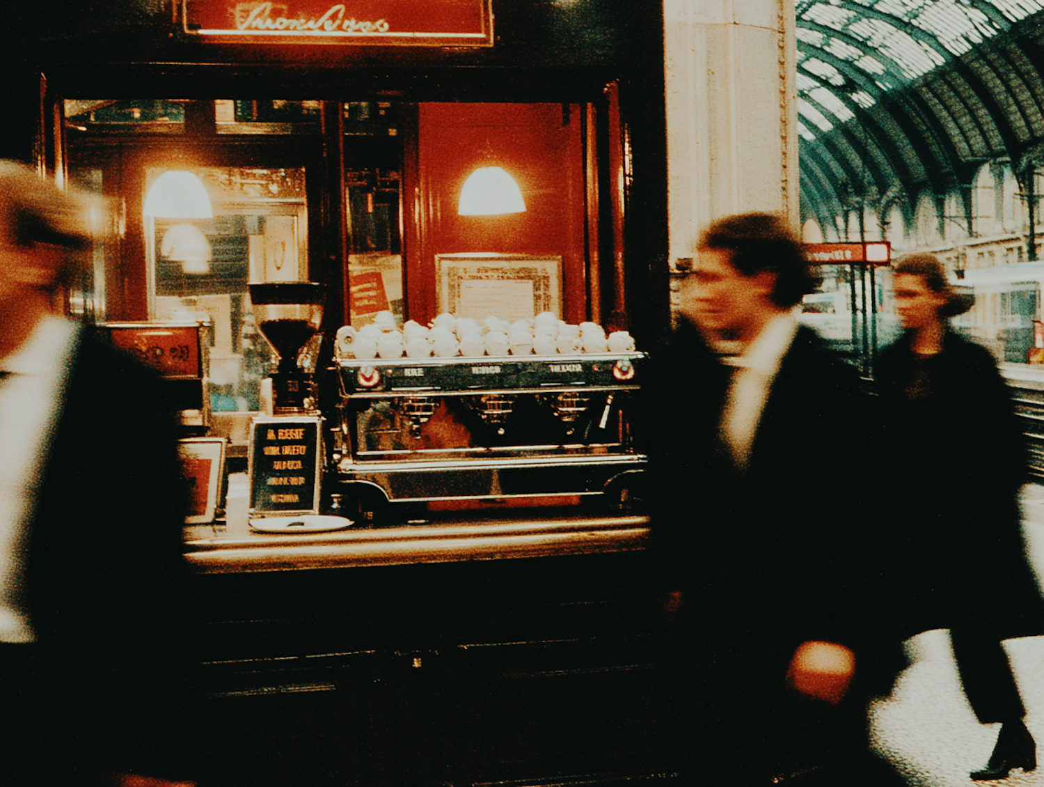 A warm-toned image of a coffee shop counter in a train station, featuring an espresso machine and blurred figures in motion.