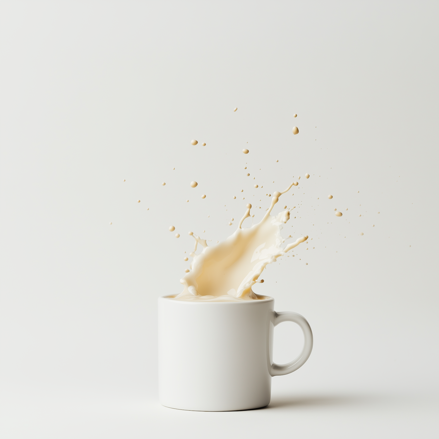 A white mug with coffee or tea splashing out, captured mid-motion against a minimalist beige background.