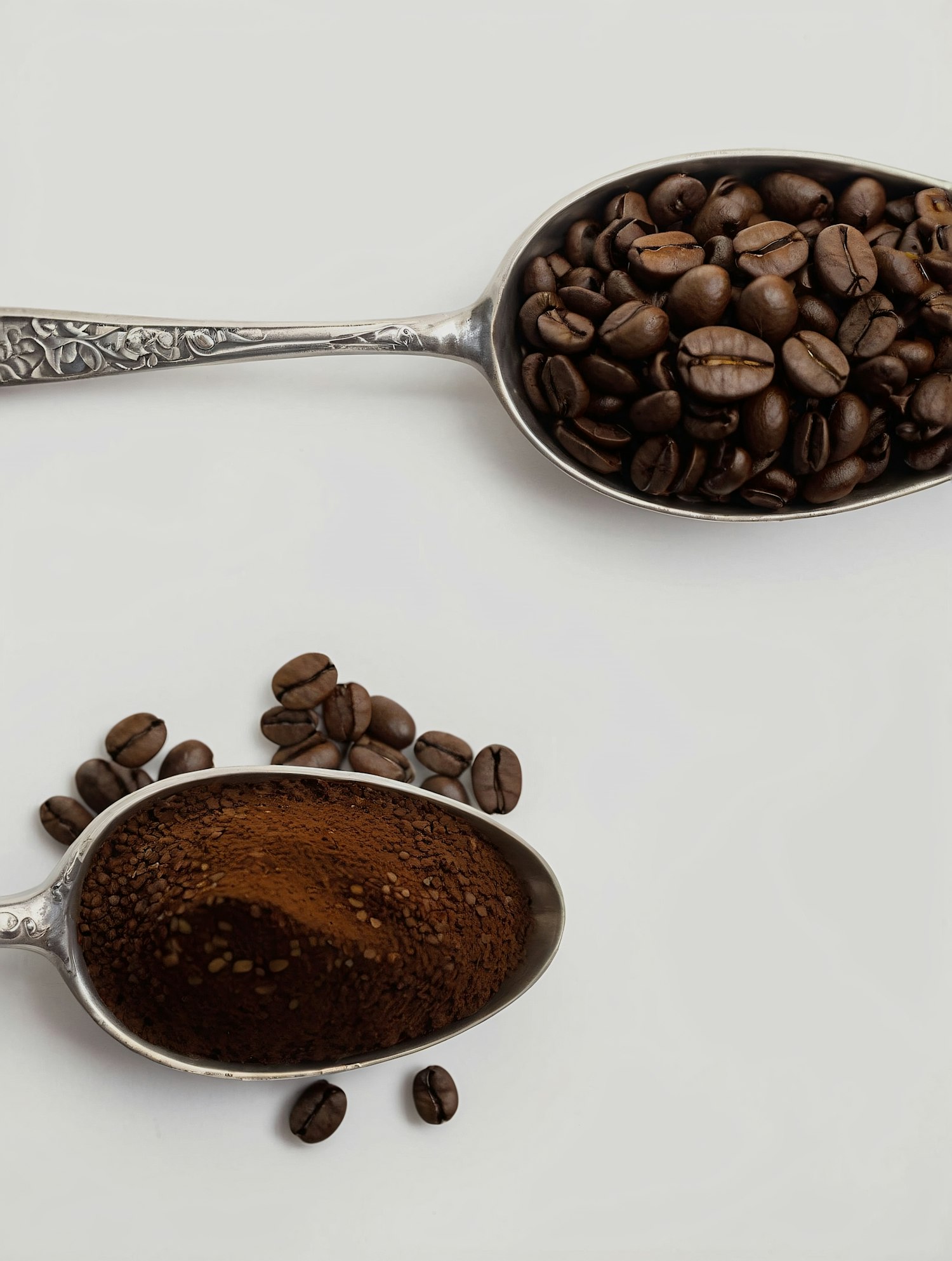 Elegant silver spoons with coffee beans and ground coffee on a white background. Perfect for coffee lovers and rustic kitchen aesthetics.