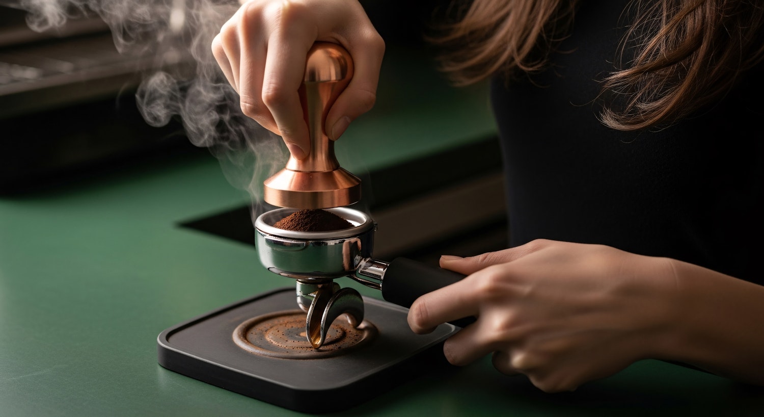 Close-up of hands tamping coffee grounds in a portafilter with a copper tamper, steam rising, on a green countertop.