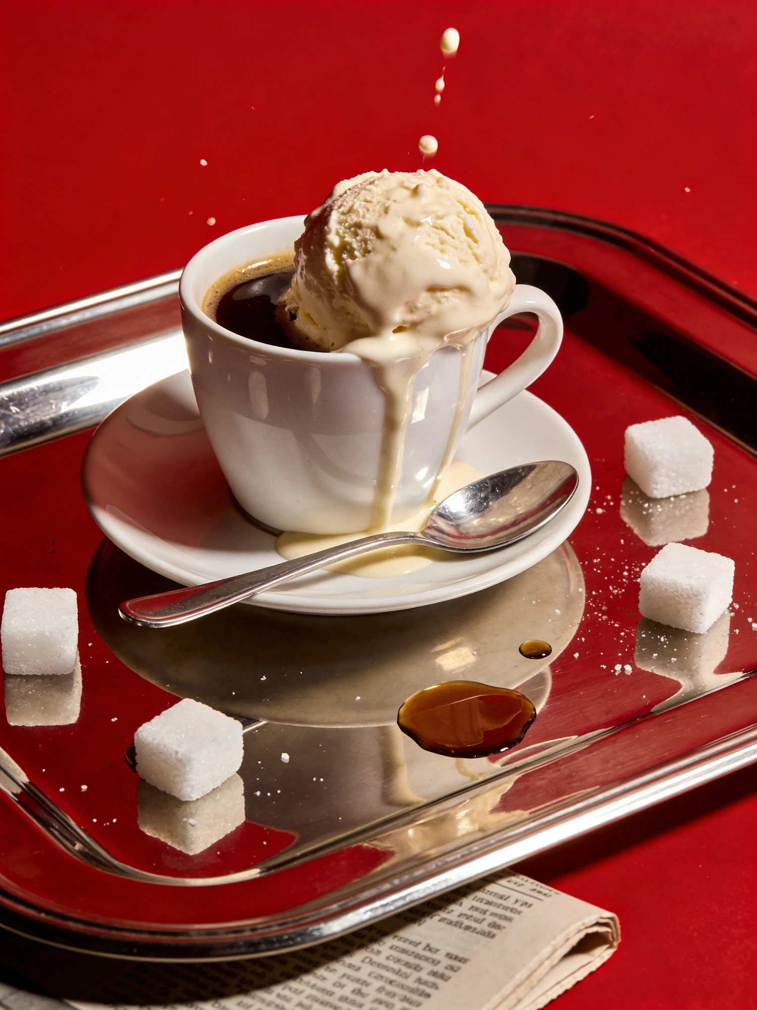 chrome shiny reflective tray with coffee cup and melting vanilla ice cream with a spoon, scoop slowly dripping over the edge. Add some cubes of sugar around the tray and one coffee spilled on the tray. A newspaper on the bottom corner of the tray placed on a bold red background composition slightly off center, liquid dripping creates movement + master style
