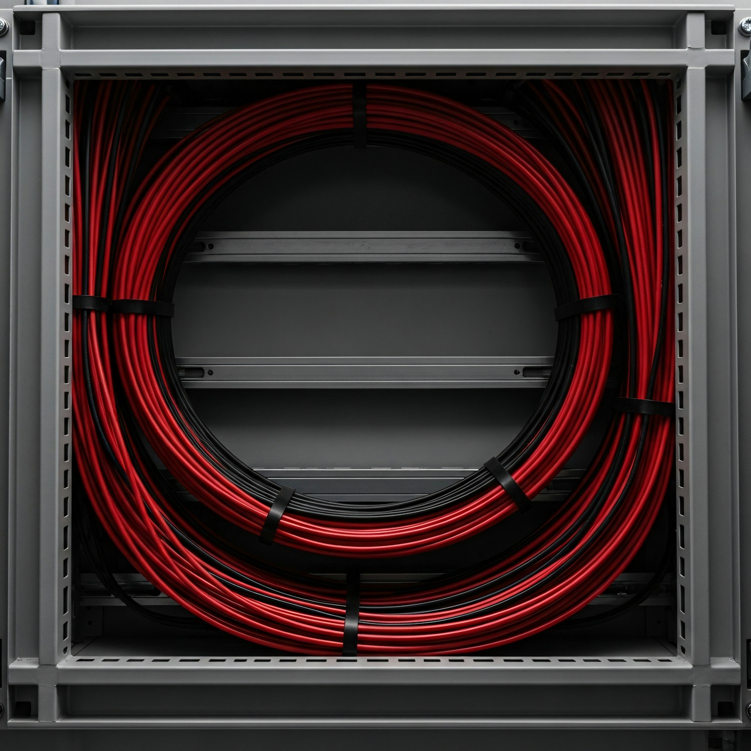 Neatly coiled red and black cables secured in a gray industrial rack, showcasing organized wiring in a professional setup.