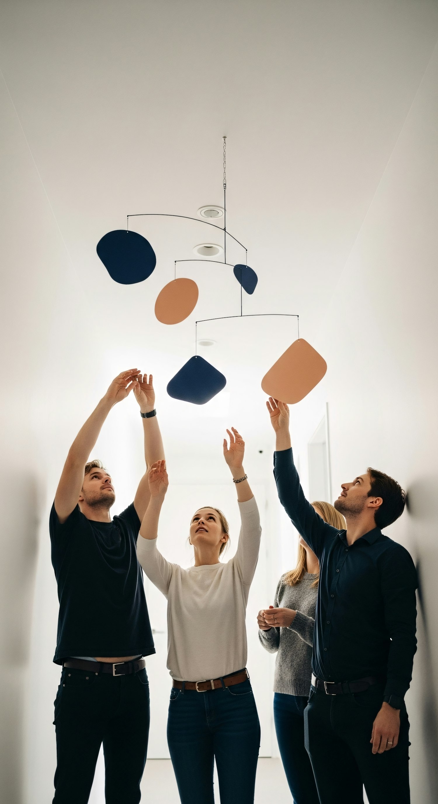 Four people interact with a modern hanging mobile in a bright, minimalist room, showcasing teamwork and creativity.