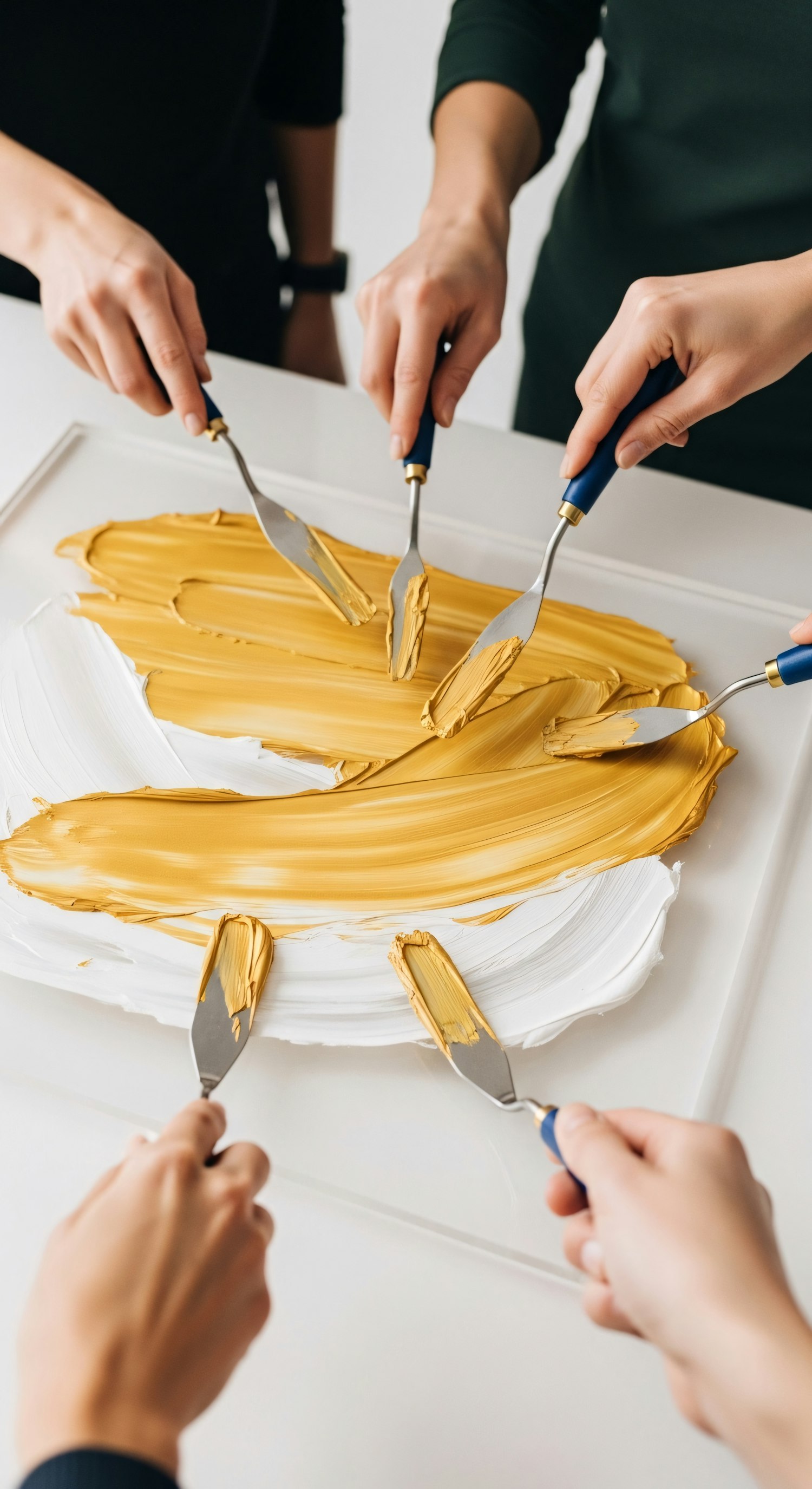Hands using palette knives to spread white and golden paint on a surface, showcasing a collaborative art project in progress.