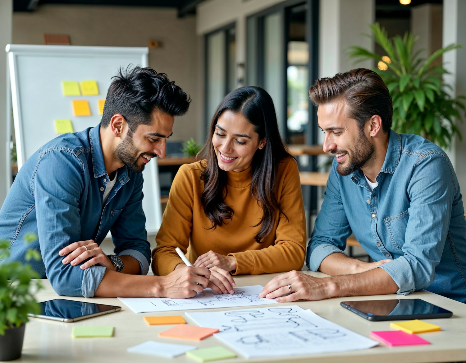Three colleagues collaborate at a table, surrounded by notes and tablets, in a creative office setting.
