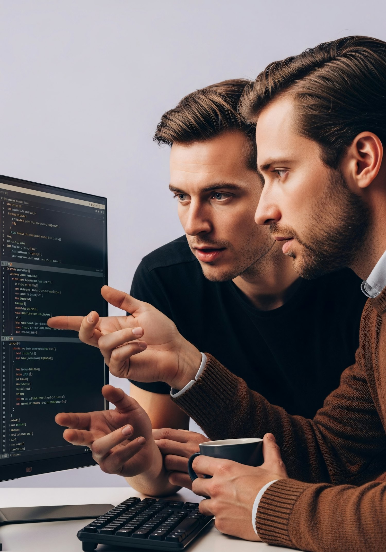 Two individuals collaborate on coding, intently discussing a computer screen displaying code, showcasing teamwork and focus.