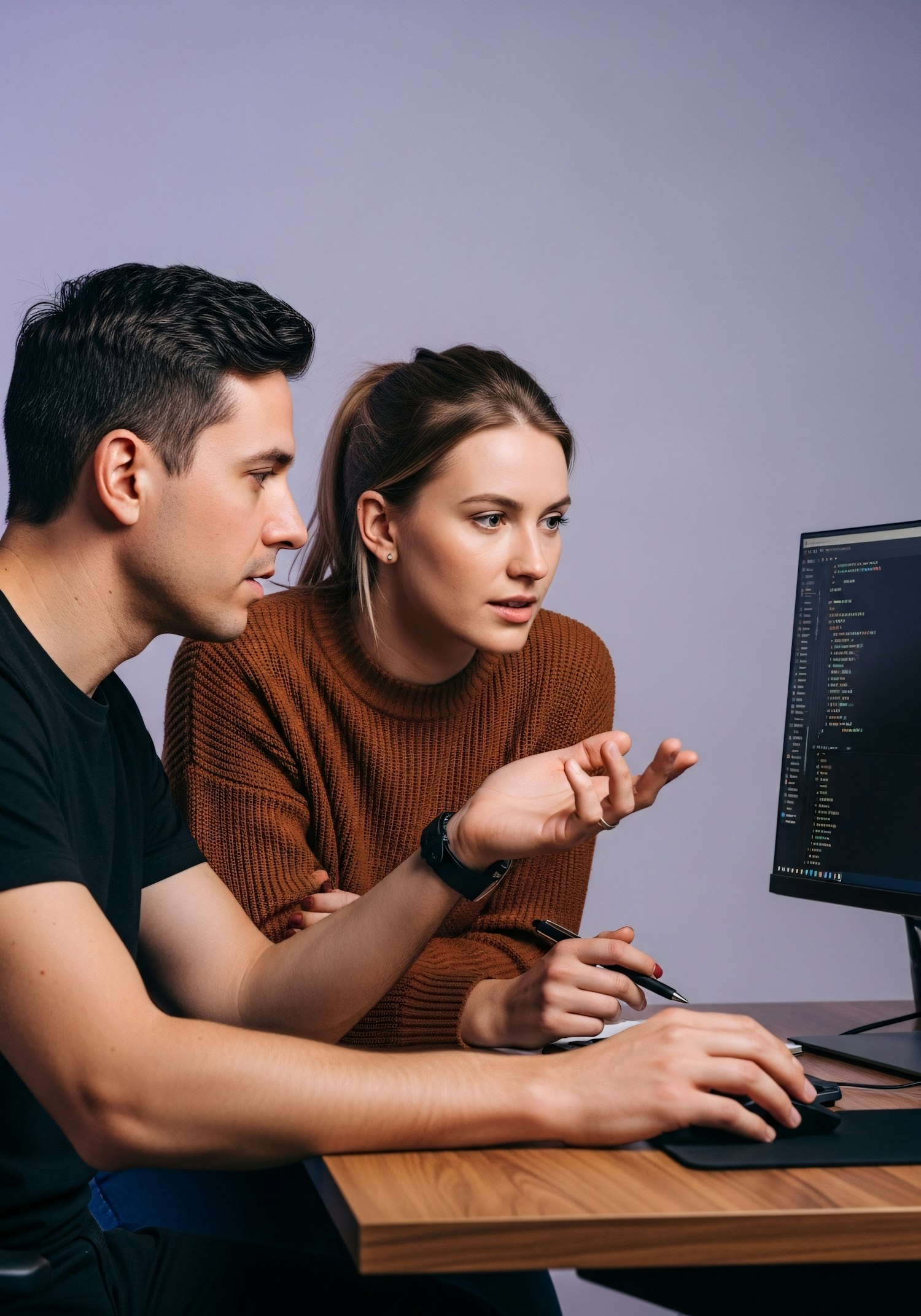 Two individuals collaborating on a coding project, focused on a computer screen, in a modern and professional setting.