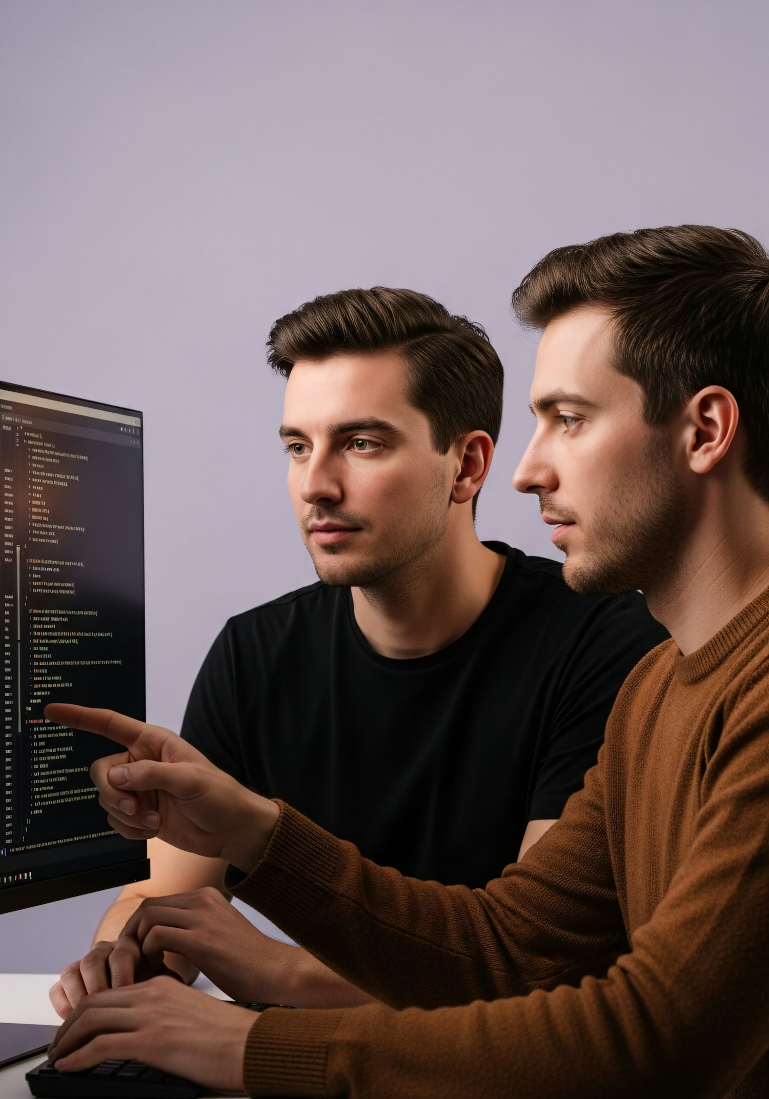 Two individuals collaborating on coding at a computer, one pointing at the screen, in a focused and professional setting.