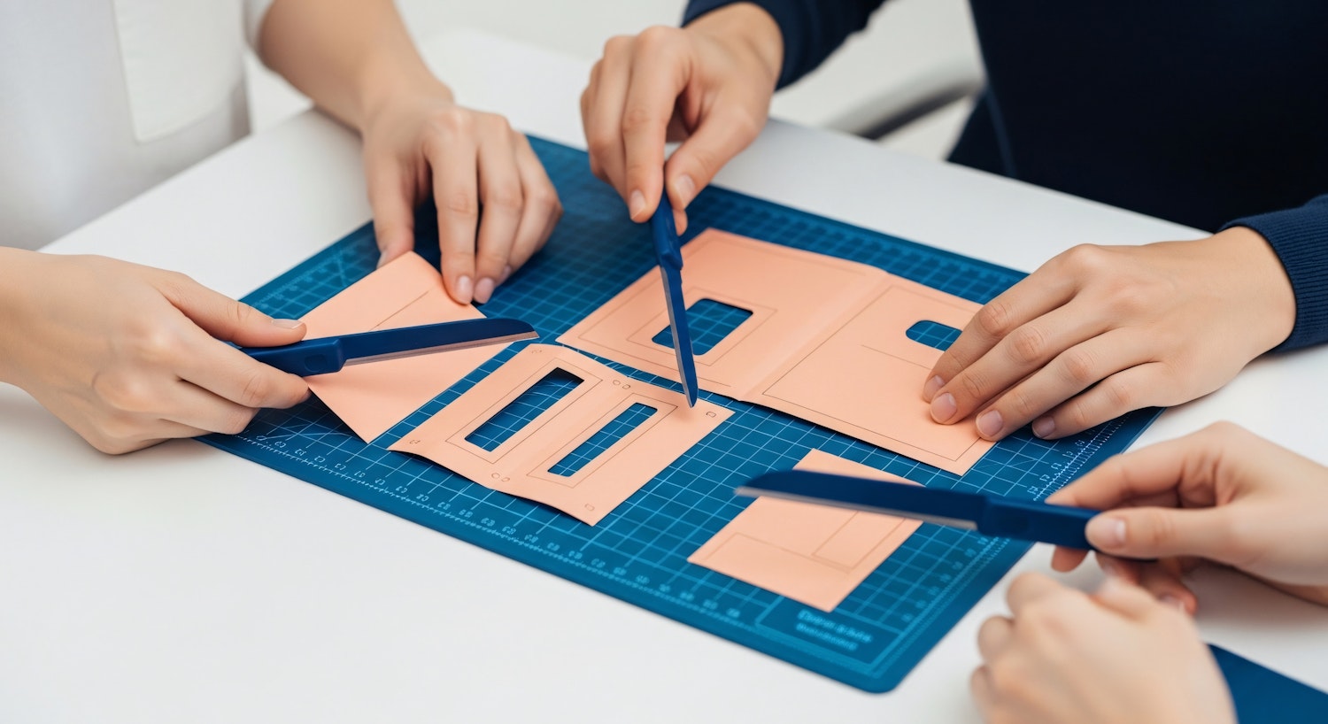 Hands working together on a crafting project with tools and paper on a blue cutting mat, showcasing teamwork and creativity.