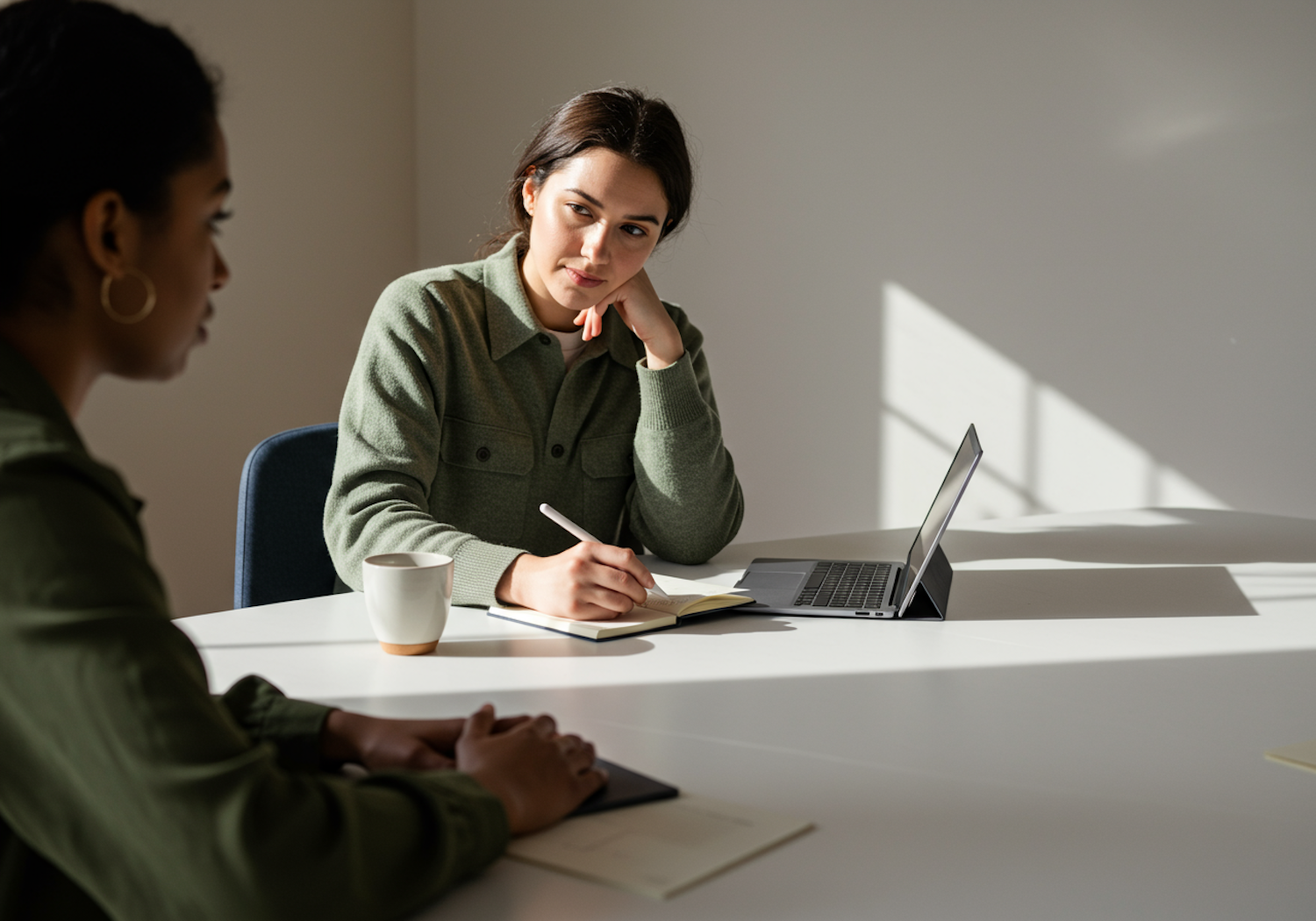 Two people in a bright room, one writing in a notebook with a laptop nearby, engaged in a professional or academic discussion.