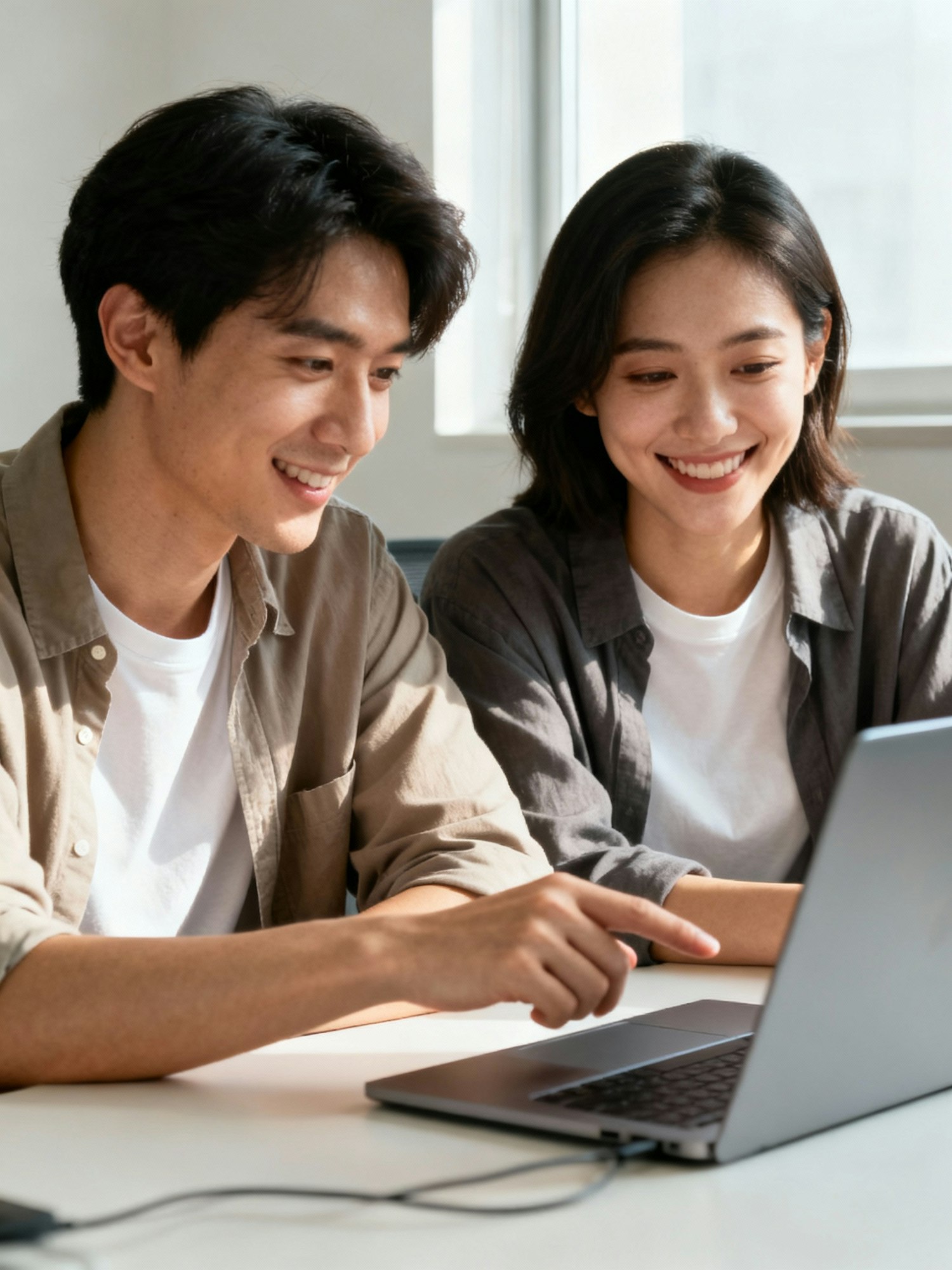 Editorial two-person portrait at a shared desk, one pointing at laptop, the other smiling; tees + casual overshirts. Soft window key + rim; 5600 K. Lens 50 mm; composition: side-by-side, clean background. Negative: messy wires, brand marks, harsh shadows.