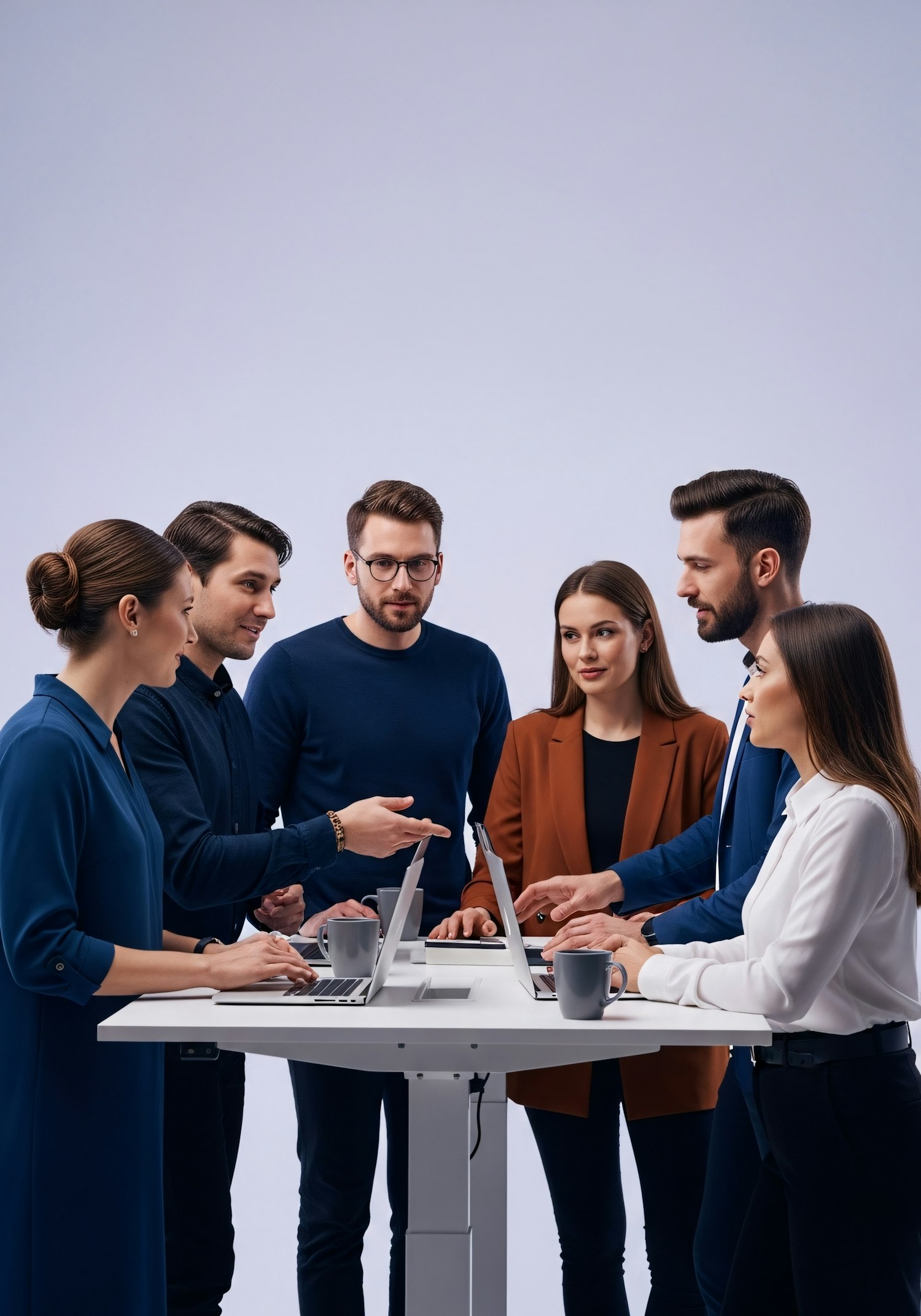 A team of professionals collaborates around a standing desk, discussing ideas with laptops and coffee mugs in a modern office setting.