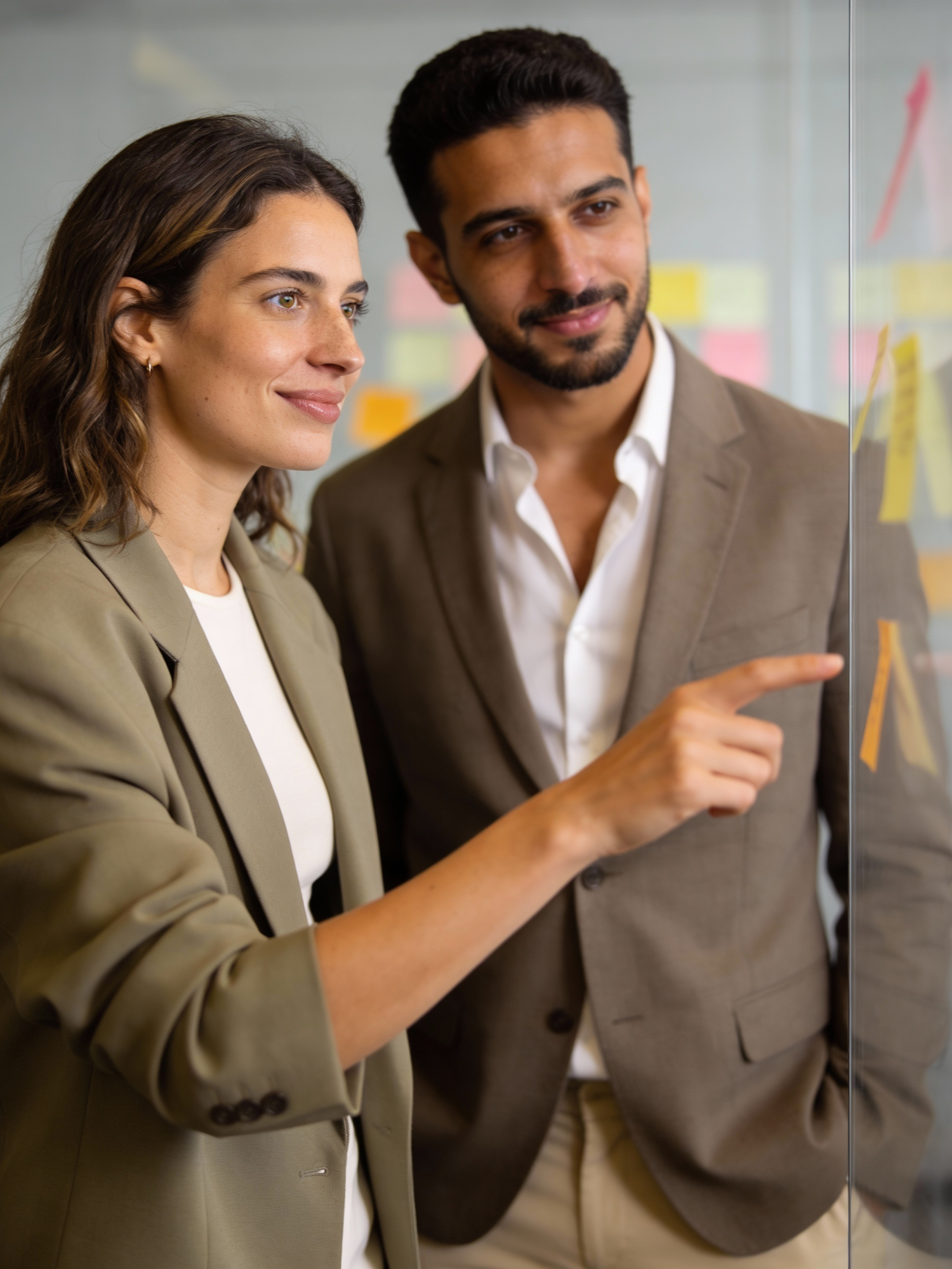 Two professionals collaborate in an office, discussing ideas on a glass board with colorful sticky notes.