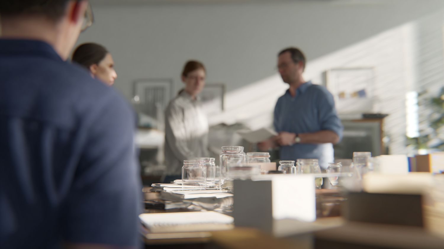 A group of people in a bright room discussing around a table with jars and documents, creating a collaborative and professional atmosphere.