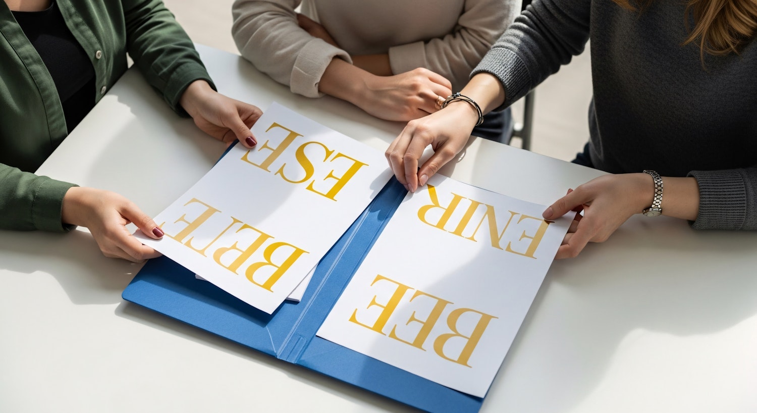 Three people collaborate at a table, reviewing documents with bold yellow text in a blue folder, in a bright and professional setting.