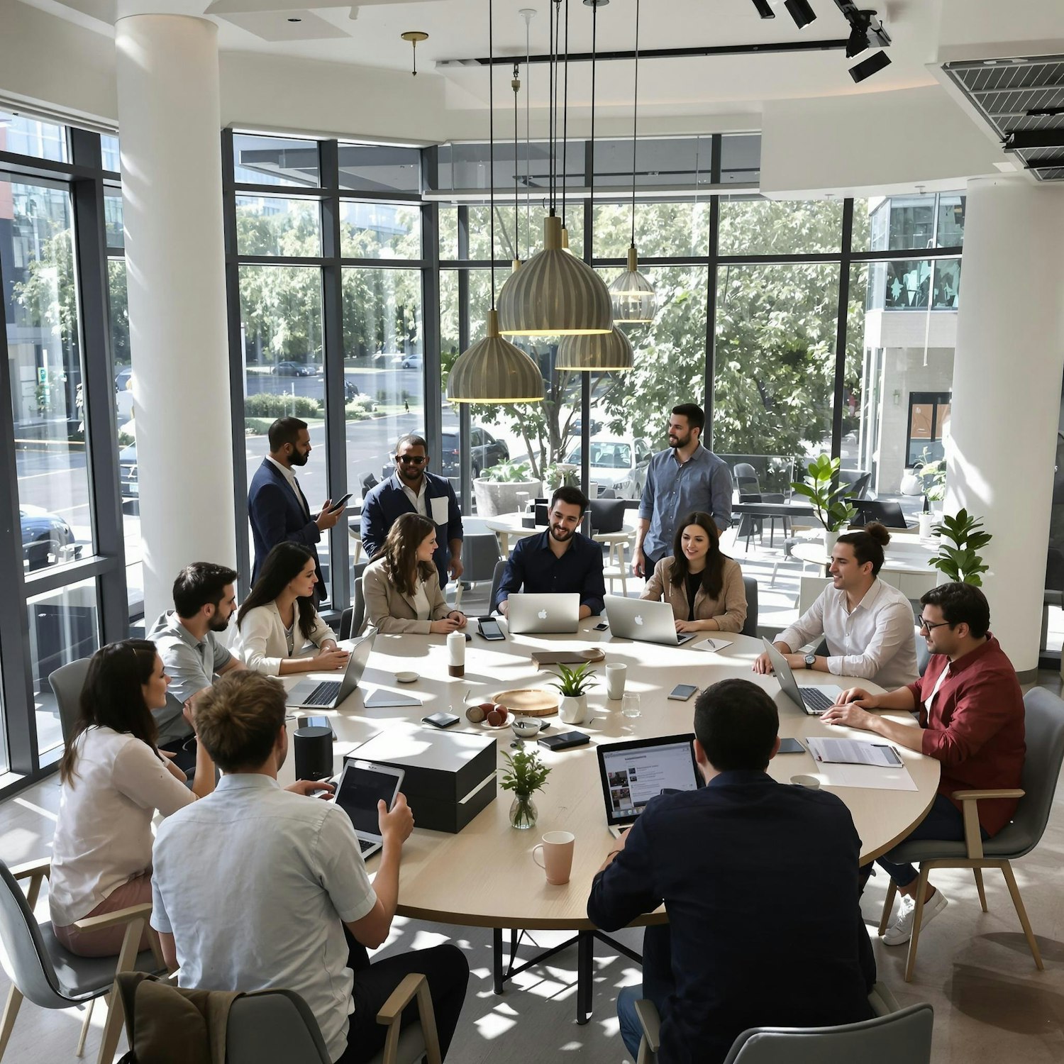 A diverse team collaborates in a bright, modern office with laptops and documents, surrounded by natural light and stylish decor.