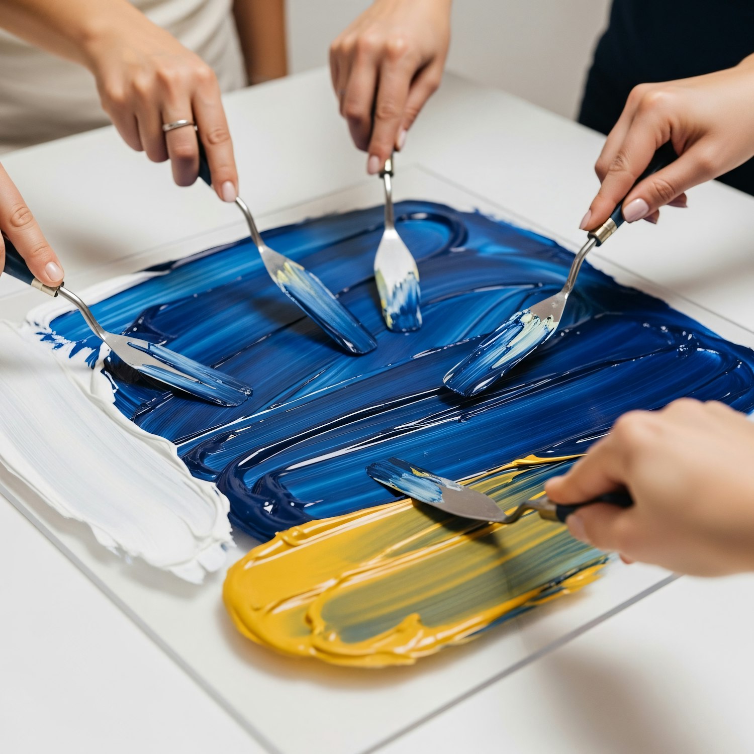Hands using palette knives to spread blue, white, and yellow paint on a surface, creating a textured and vibrant artistic composition.
