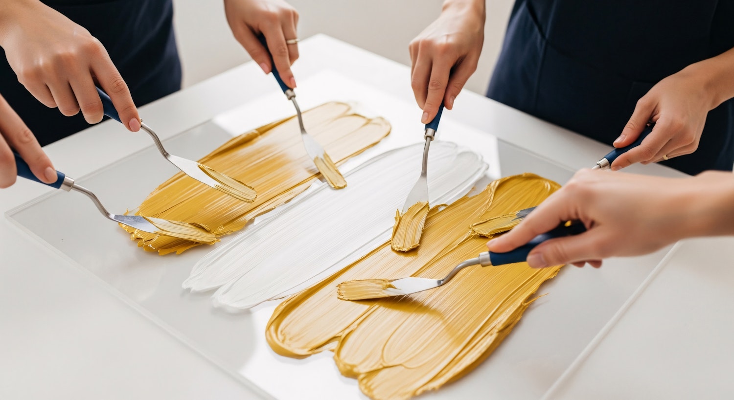Hands using palette knives to spread golden yellow and white paint on a flat surface, showcasing a collaborative art project.