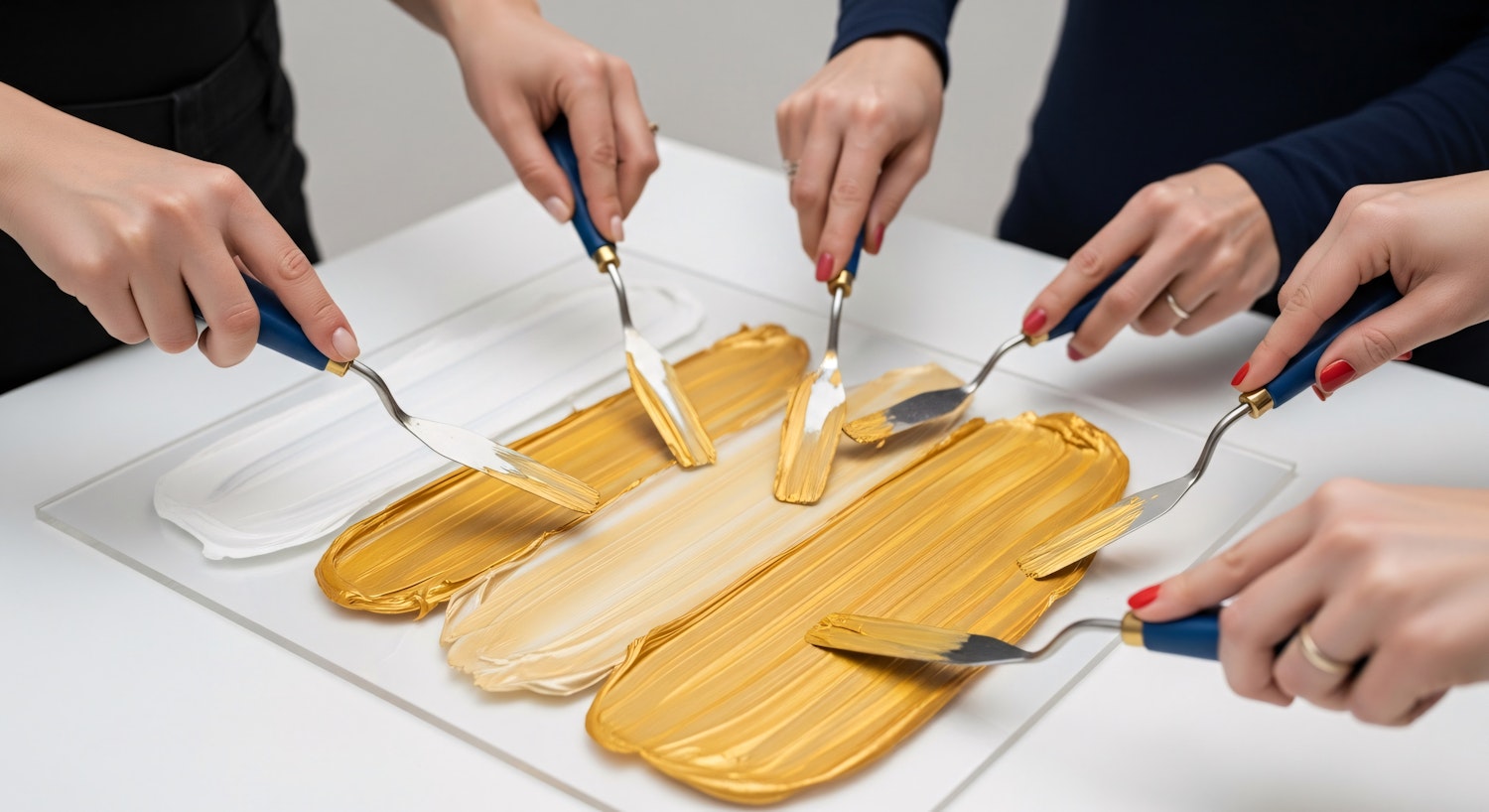 Hands using palette knives to spread white and gold paint on a surface, showcasing a collaborative and artistic process.