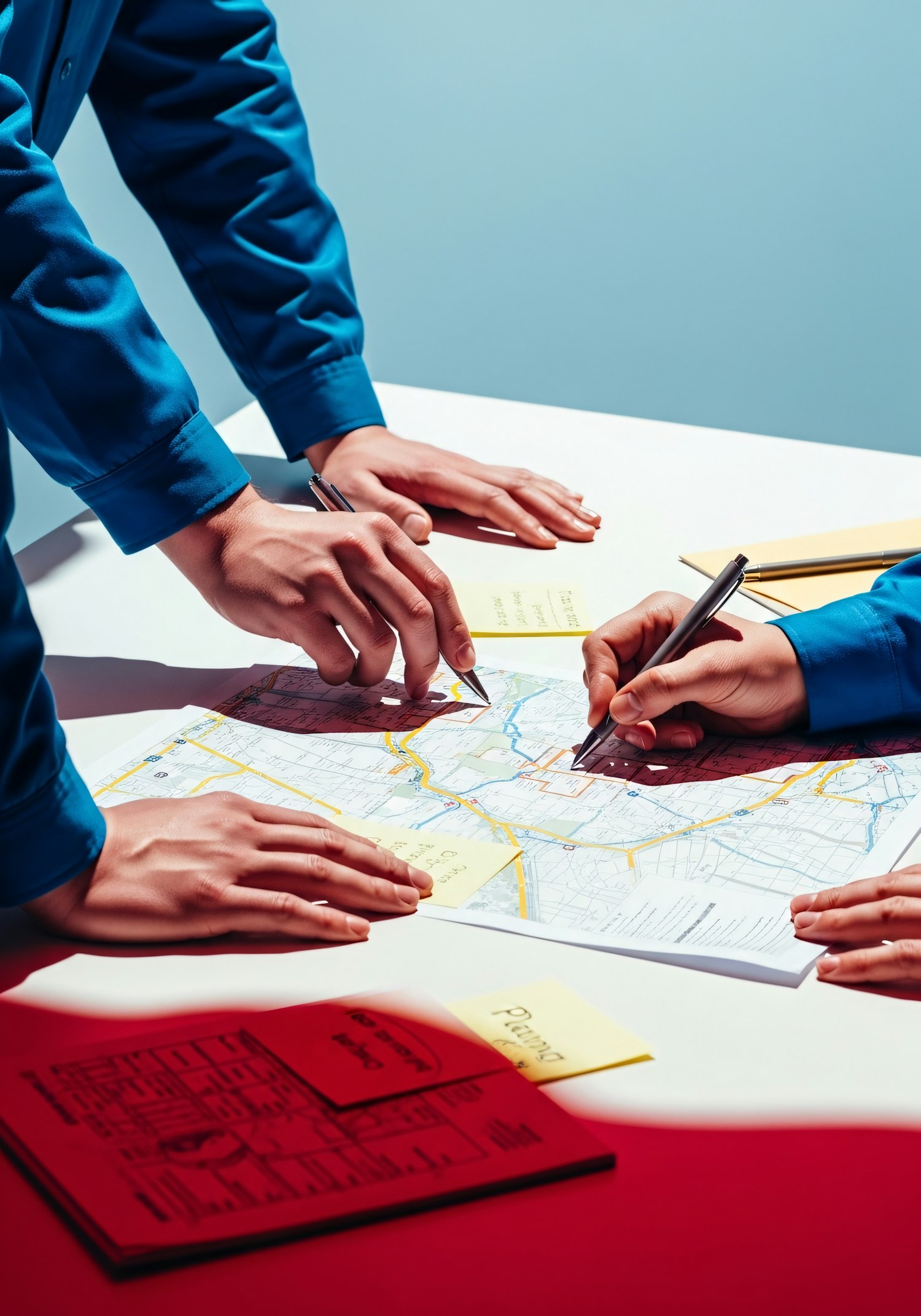 A group collaborates on a map with pens and notes, suggesting a planning session. Bright lighting highlights the details and materials.