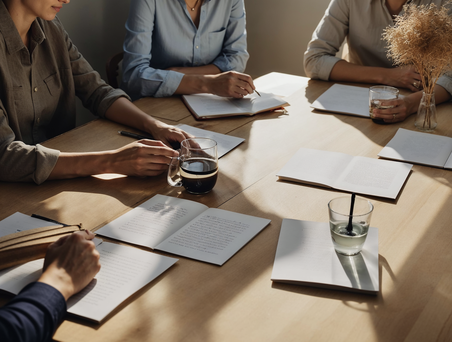A cozy study session with open books, coffee, and sunlight streaming in. Perfect for group discussions or collaborative work.