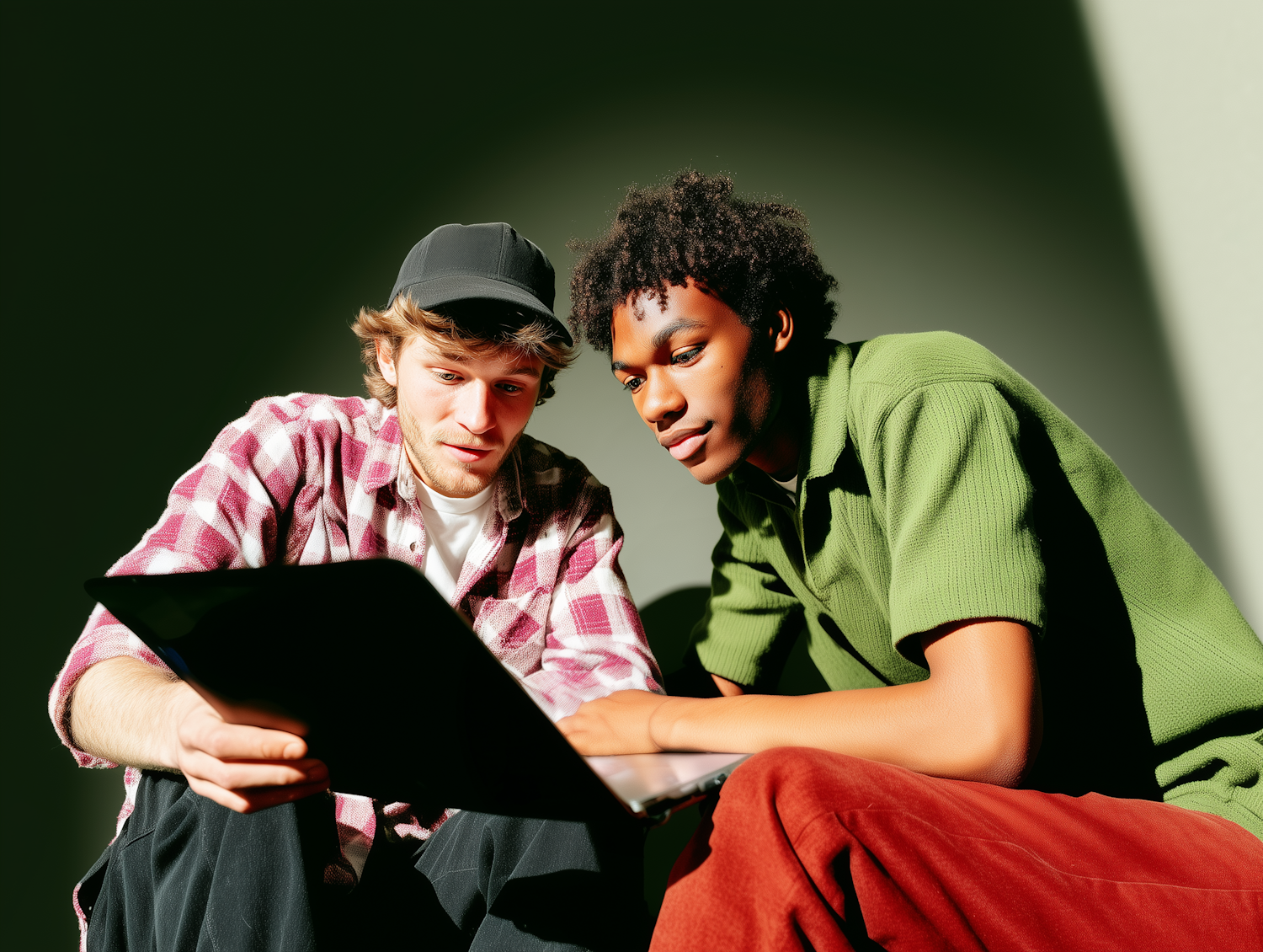 Two people collaborating on a laptop, one in a plaid shirt and cap, the other in a green shirt, against a green background.