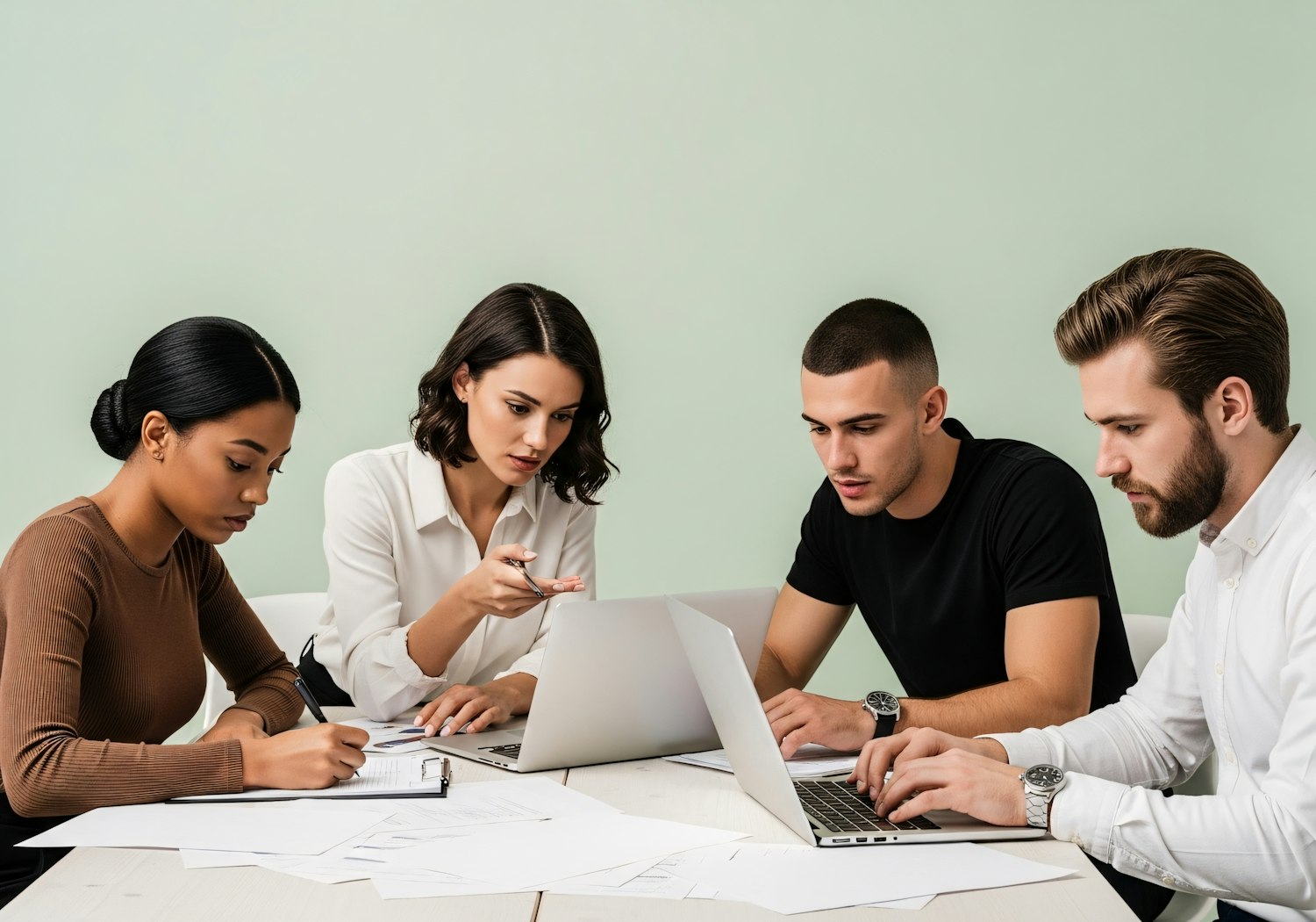 A diverse team collaborates on a project, working with laptops and documents in a modern, professional setting.