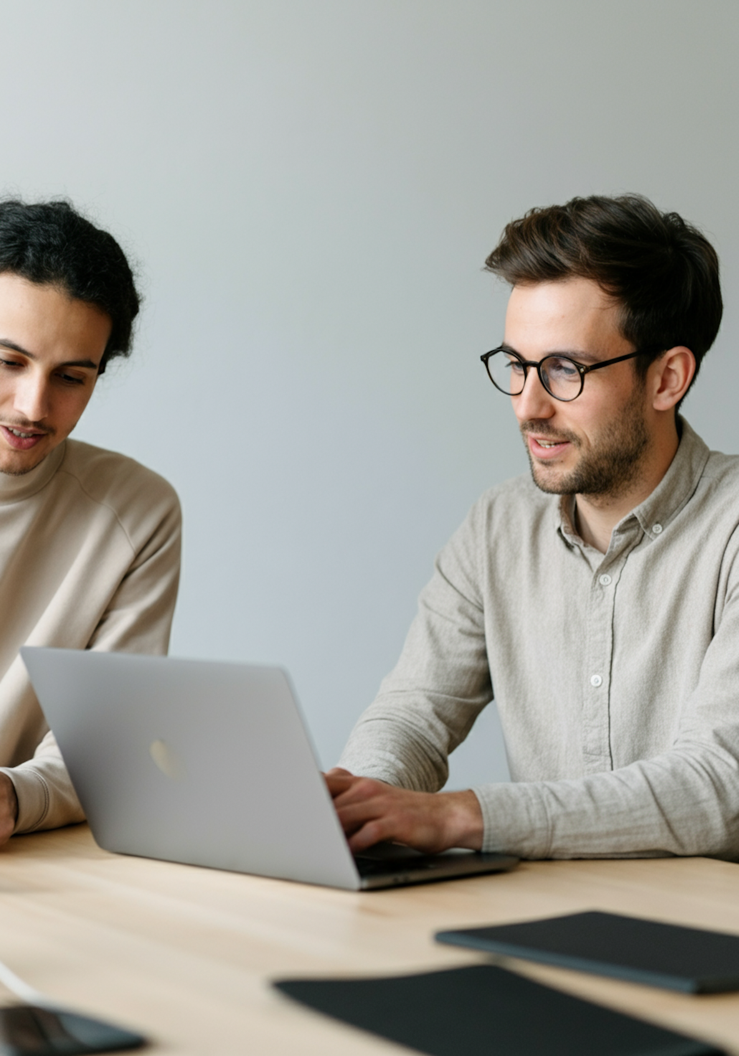 Two men collaborating on a project using a laptop at a wooden table, with a clean and minimalistic background.